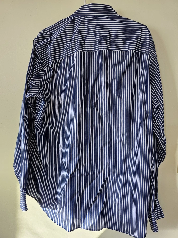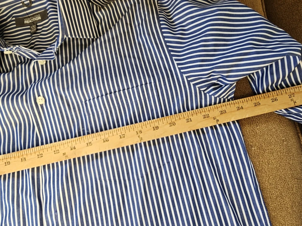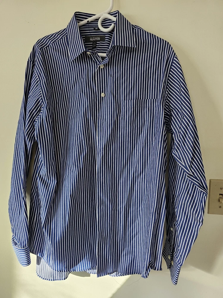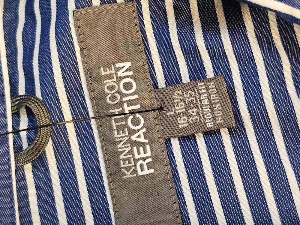 This is a men's dress shirt from Kenneth Cole Reaction in size Large. It features blue and white stripes, a collared neckline with a button-down style, and long sleeves with button closures. The shirt is made of 100% cotton and has a regular fit. The model is classic and the shirt was made in Bangladesh.