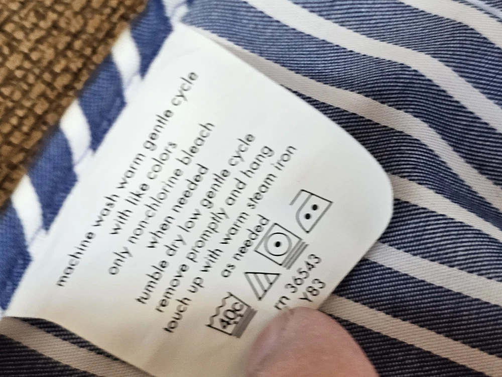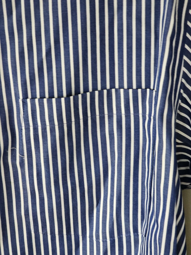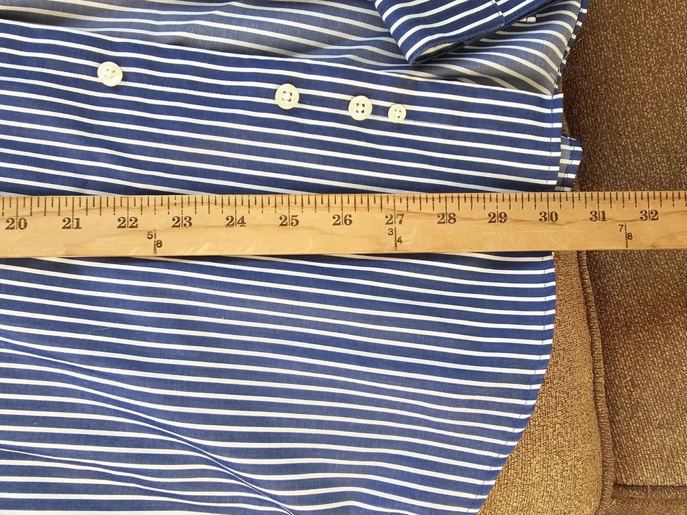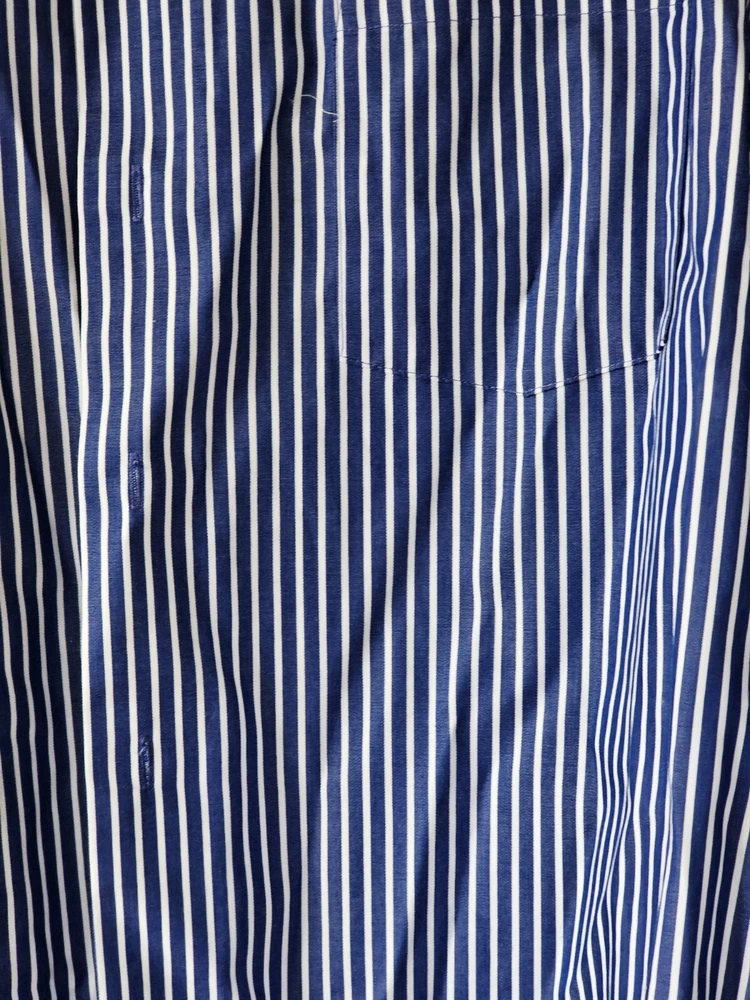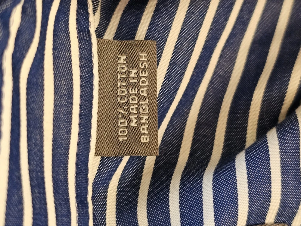 This is a men's dress shirt from Kenneth Cole Reaction in size Large. It features blue and white stripes, a collared neckline with a button-down style, and long sleeves with button closures. The shirt is made of 100% cotton and has a regular fit. The model is classic and the shirt was made in Bangladesh.