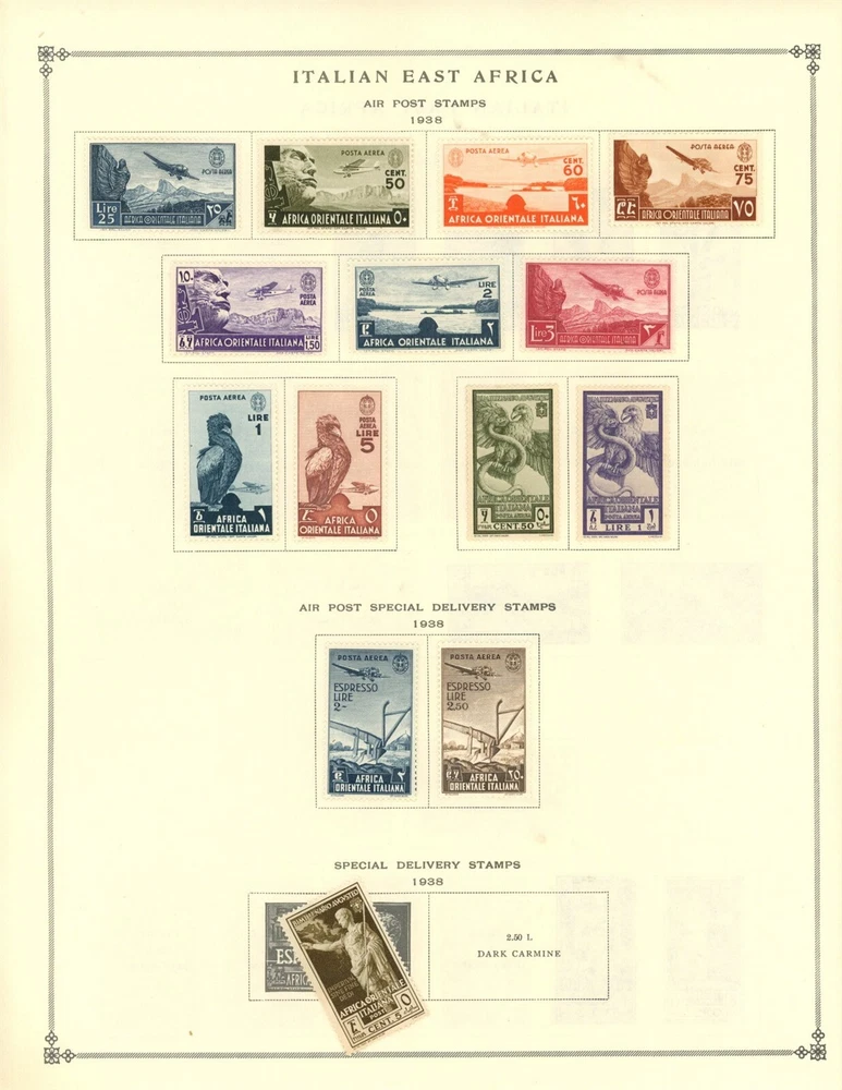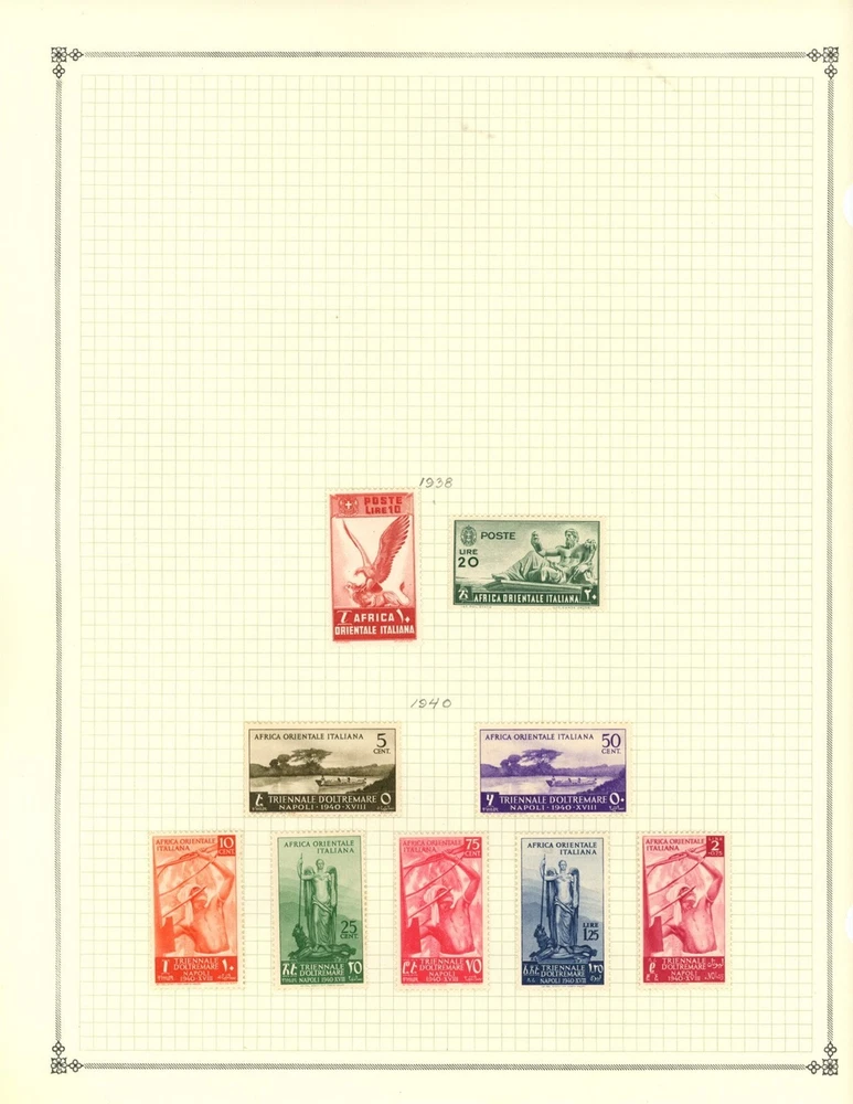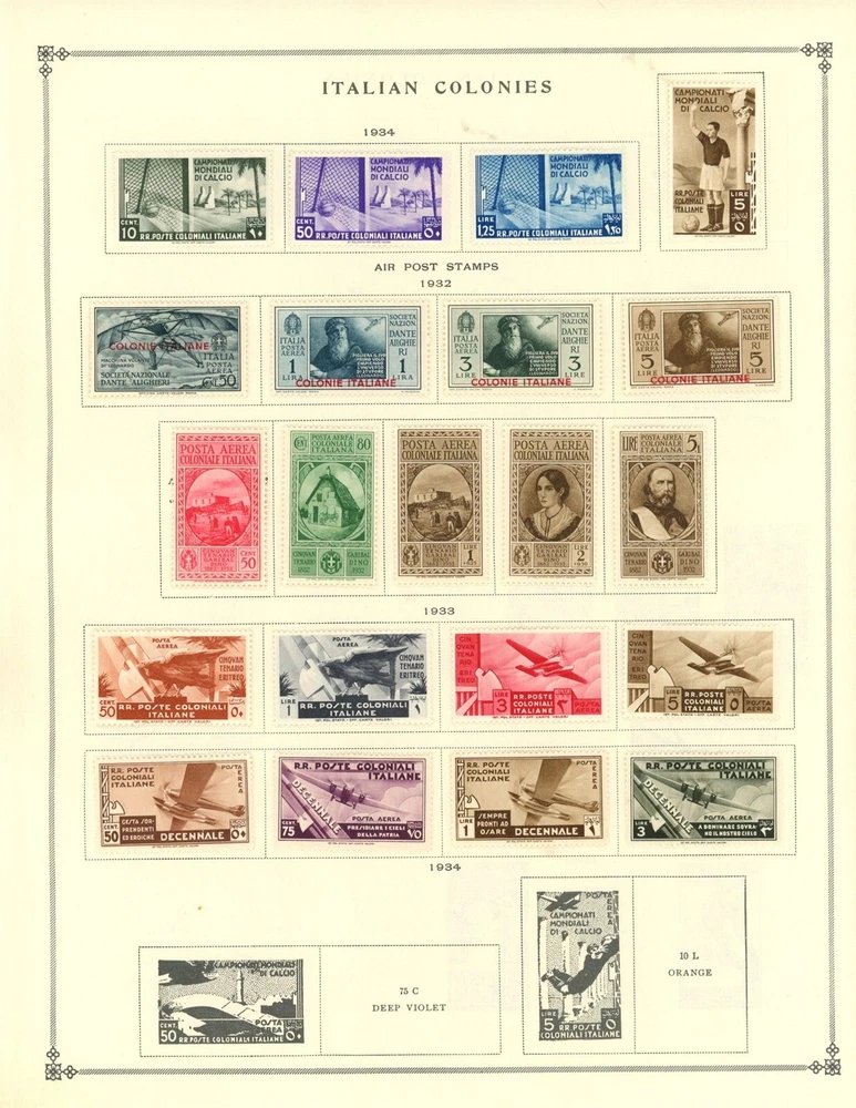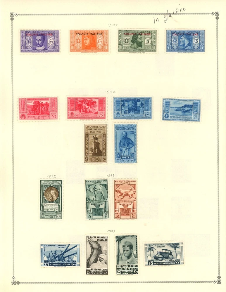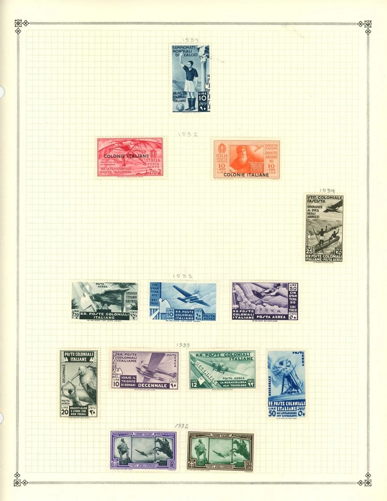 Kenr2: Italian Colonies Collection from Clean 1840-1940 Scott Album Note; The 3rd page is in a glassine This collection is from a classic Scott International Volume I 1840-1940 with many extra pages added. The is extremely neat and clean including the stamps. The pages are ready to be inserted into your album if you want. The stamps are very lighly hinged probably using Dennison hinges, they peel off effortlessly. All stamps included in the auction are shown and be sure to see the pictures shown below the description not just those at the top of the page. The stamps will be shipped on pages as shown with stiffener to prevent bending. Unfortunately forgeries are a part of stamp collecting and almost every collection has some. I buy large quality collections from major auction houses, break them down and bring them to Ebay. I don't attempt to identify forgeries or reprints or purge them from the collections I sell. I sell the country collections intact as received without removing any stamps and use large scans so the bidder can evaluate the stamps for themselves. So please look at the scans and bid on what you see. You may be interested in our other eBay listings . Welcome to our Stamp Business: Kenr2. Policies; We hope to bring an interesting and unusual selection of items to Ebay each week. Our general focus is on country collections on pages but we often have WW Revenues, Proofs and occasionally collections and Postal History. Our 1st priority is that you are satisfied with your buying experience with us, and we work hard to make this happen. I try hard to accurately describe all stamps and covers and show good pictures. Occasionally I miss something or simply make a mistake, but if you are unhappy with an item for any reason please contact us using the Ebay message system and we will make it right. Member of APS and USPCS Shipping; We keep our shipping charges as low as possible and never charge a handling fee. For the summer we are offering FREE shipping on all Domestic Purchases. Please wait for our Invoice to take advantage of this offer. NOTE: Ebay rules require tracking and the use of USPS shipping labels on all shipments. Therefore, we are not able to use postage stamps to mail our shipments. NOTE to INTERNATIONAL bidders: We cannot combine items for shipping to International destinations. If you think these shipping costs are too high I respectfully ask you NOT to bid. Ebay/USPS labels are printed automatically with a customs form. We are not responsible for any customs or VAT charges, again we cannot make any exceptions. Thanks for Looking Powered by SixBit's eCommerce Solution