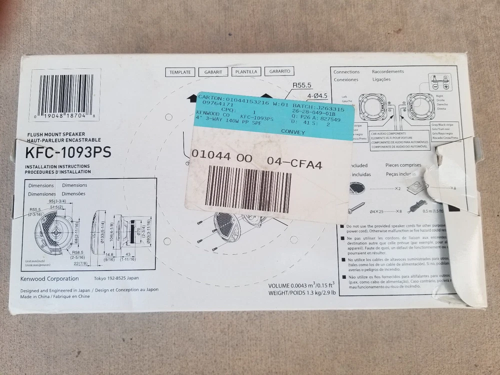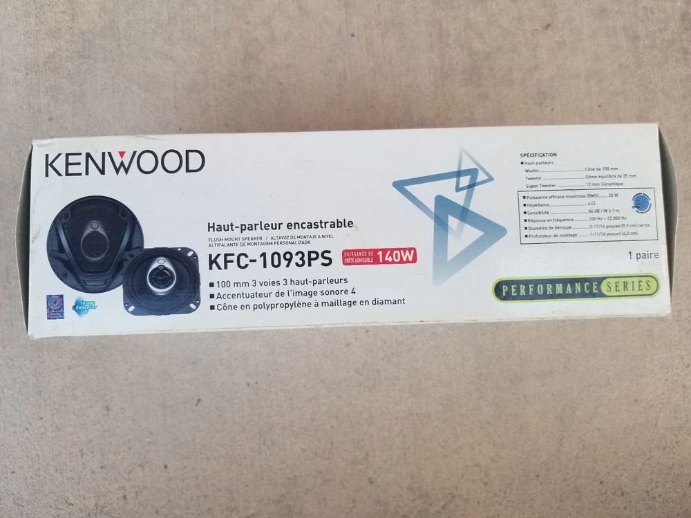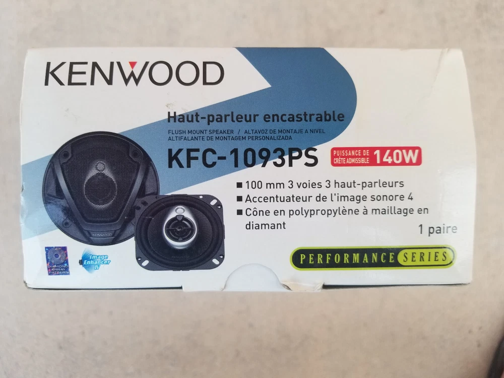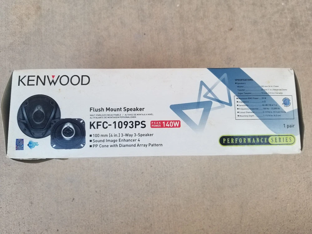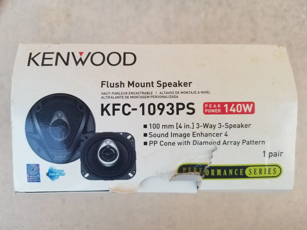 Note: As can be seen from the photos, the box is damaged. However, the package has never been opened. Kenwood KFC-1093PS Features & specs Speaker Size Driver Design 3-way Woofer Design Cone Woofer Material Polypropylene Woofer Surround Rubber Midrange Design --- Midrange Material --- Tweeter Design 1" Balanced Dome Tweeter Material PEI Super Tweeter Design 1/2" Flat Super Tweeter Material Ceramic Impedance (Ohms) 4 Weather-resistant --- Grilles Included Black metal, Gray plastic Specifications Sensitivity (1W at 1 meter) 86 Sensitivity at 2.83 volts N/A Frequency Response 100 - 22k Hz Maximum RMS Wattage 35 Peak Power Handling (Watts) 140 Top-mount Depth (Inches) 1 3/4" Bottom-mount Depth (Inches) 1 13/16" Cutout Diameter or Length (inches) 3 11/16" Mounting Height (Inches) 0.59" Frame Width 4.1" Frame Length 4.1" Features Image Enhancer: The KFC-1093PS is equipped with Kenwood's Image Enhancer 4 surrounding the tweeters. Its smooth rounded surface eliminates most of the reflected sound waves that would interfere with the direct sound waves coming from the tweeters. The end result is a better dispersion pattern, less distortion, and clear high-frequency reproduction. Cone Woofers: The woofer cones are textured Polypropylene with rubber surrounds. Polypropylene woofers are resistant to moisture and temperature extremes found in automotive applications. Tweeters: Each speaker has a 1" PEI balanced dome tweeter. A semi-dome tweeter has a dome placed inside a cone. Balanced dome tweeters are semi-dome tweeters with equal reproduction area given the cone and dome portions of the tweeter. Flat Super-Tweeters: The speaker also utilizes a 1/2" ceramic, flat super-tweeter for added high frequency reproduction.