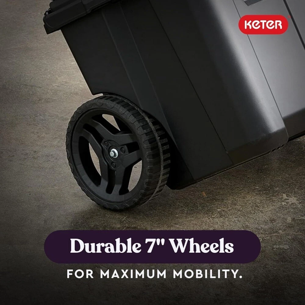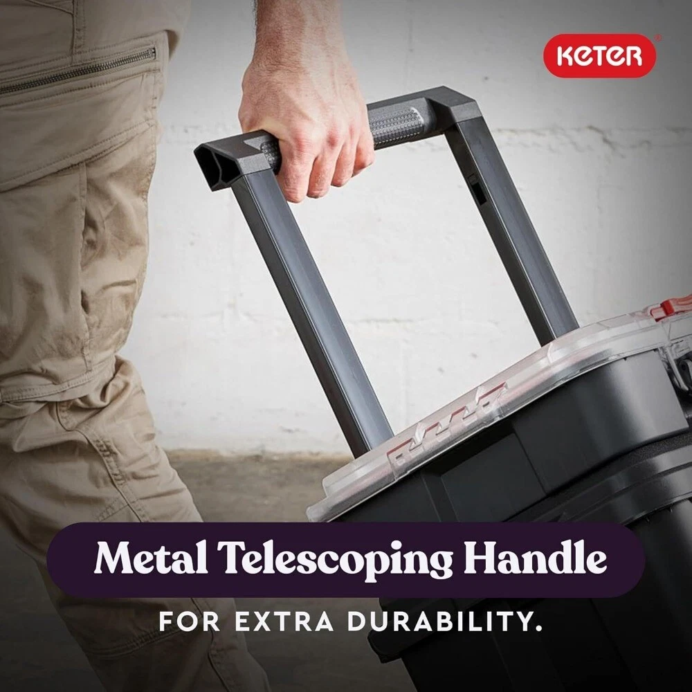 Package: 1X Keter Stack-n-Roll Modular Tools Organizer for Garage Storage and DIY, 3 Piece Resin Rolling Tool Box System for Small Parts Description: Durable and Lightweight construction makes this modular tool storage system perfect for home use The system is an interlocking, customizable, mobile workshop that includes a cart, toolbox and organizer Snaps close wit audible latches that confirm your contents are secure Metal telescopic handle with 7” durable wheels and side grips for maximum mobility to your next project or jobsite Features a transparent polycarbonate lid on the small parts organizer