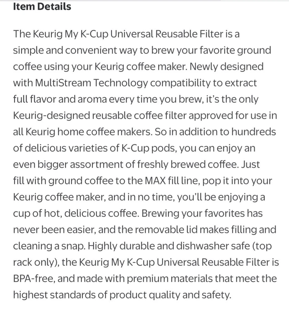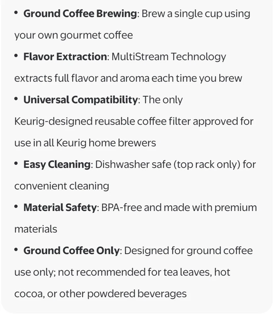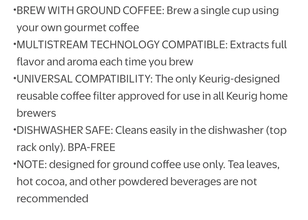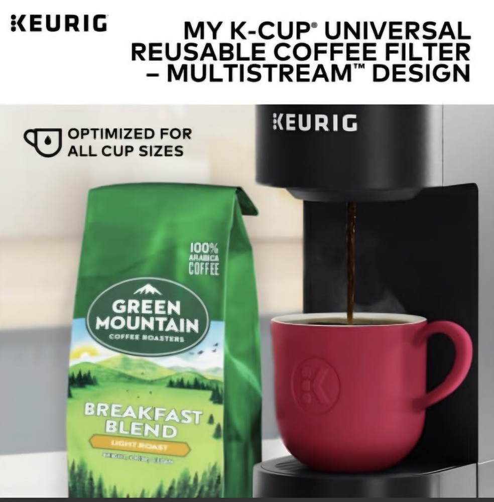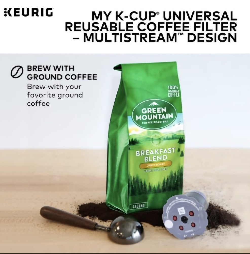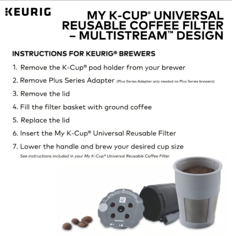 The Keurig My K-Cup Universal Reusable Filter is a simple and convenient way to brew your favorite ground coffee using your Keurig coffee maker. Newly designec with MultiStream Technology compatibility to extract full flavor and aroma every time you brew, it's the only Keurig-designed reusable coffee filter approved for use in all Keurig home coffee makers. So in addition to hundreds of delicious varieties of K-Cup pods, you can enjoy an even bigger assortment of freshly brewed coffee. Just fill with ground coffee to the MAX fill line, pop it into your