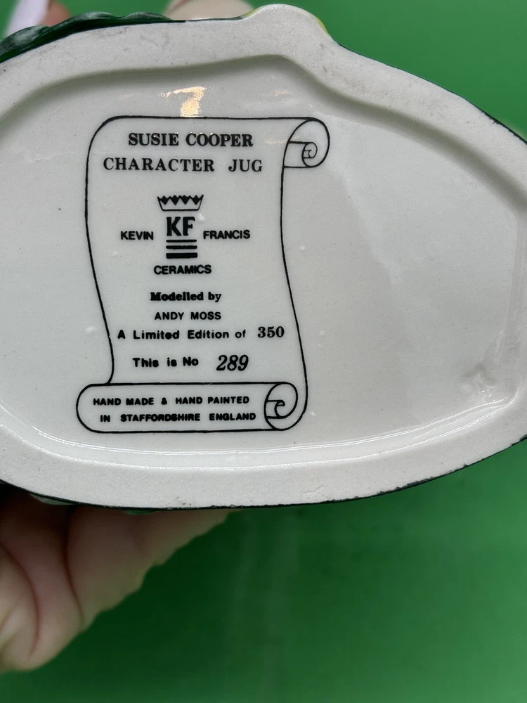 Kevin Francis Susie Cooper Toby Jug c.1994 Height:5" Ltd Ed of 350 No.289 Modeled by Andy Moss Hand made and painted in Staffordshire England Founded by Kevin Pearson and Francis Salmon in 1985, the quality and finish of Kevin Francis Ceramics is unique in today's day and age and throw back to the finest days of English pottery production. Your Jug will securely wrapped for its journey home, and a full guarantee is given on all items. *British Collectibles is owned and operated by The American Toby Jug Museum Curator Kevin Pearson of Kevin Francis Ceramics . Please wander through our shop's magnificent collection of Kevin Francis Face Pots and Banksy Street Art as well as our worldwide collection of Toby & Character Jugs, Majolica/Barbotine Pitchers and Royal Bayreuth Creamers. If you have any further questions please do not hesitate to ask. Cheers!