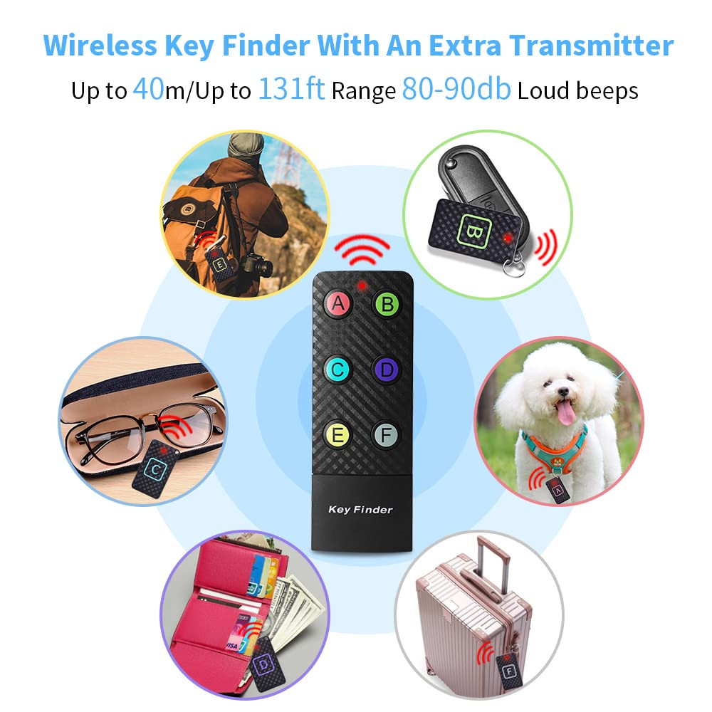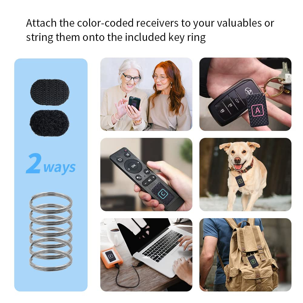 New Design & Portable Design :Easier to hear. Beep sounds from the side. Easier to hear and louder when covered. Also the transmitter with lanyard can stand alone instead of using separate base, which is always more convenient to carry and use at home or outside Sound and Light Alert: The Wireless Item Locator works excellent with 85dB louder beep (voice radiates sideways, louder than ever) and 40m/131ft working range in open terrain. Sound signals can even penetrate walls, floors, pillows, leather and more, and the LED light gives you better visibility when locating in the dark. 6 Color-Coded Receivers: Plug the receiver into any of the 6 items and simply click the color-coded button to find them. Easy to use and operate. NO APP required. Best gifts for seniors and forgetful people. Longer Battery Life: Powered by 8 CR2032 lithium cells, the receivers can work for 9 months. The standby time lasts all year. Low battery consumption makes life easy Good Present for people : Excellent for personal use or as a gift for your aging parents or forgetful friends! family member gift in any occasion
