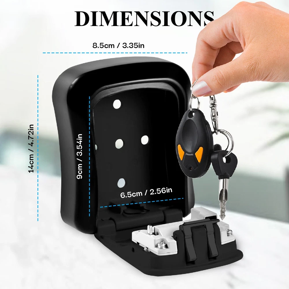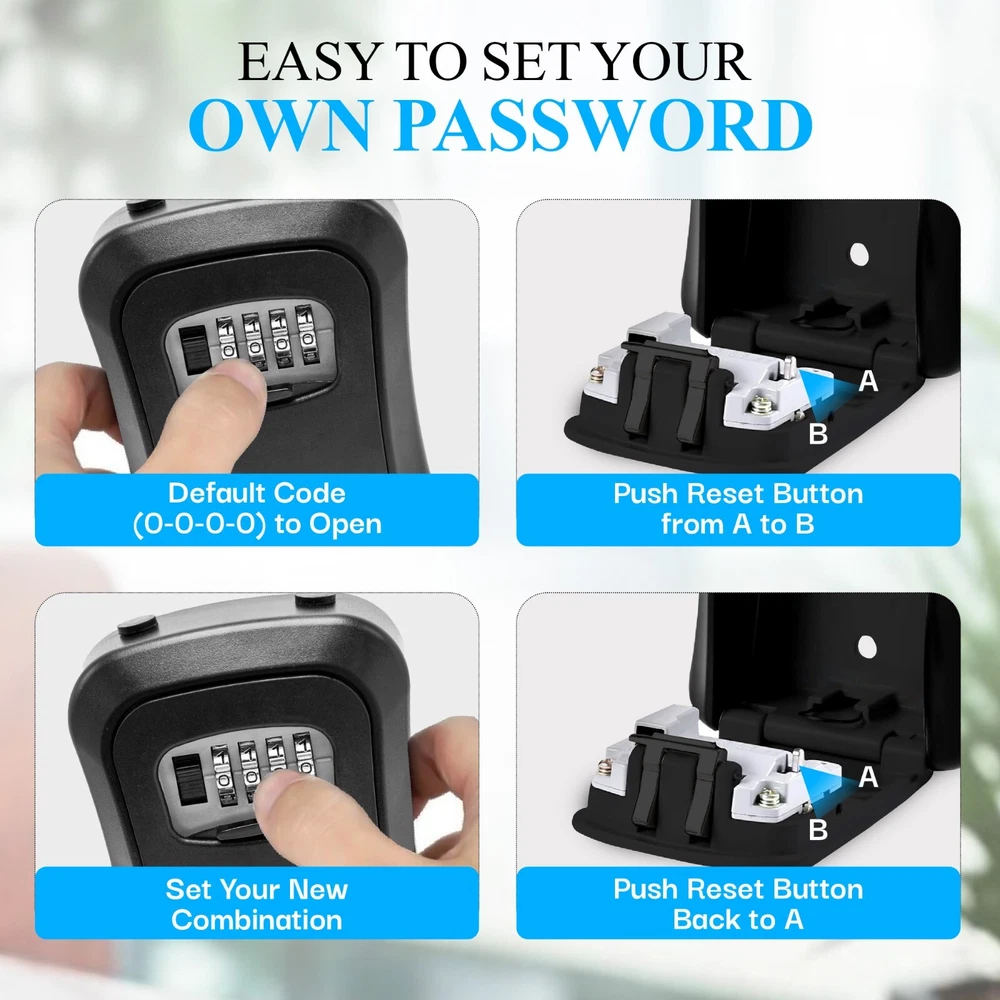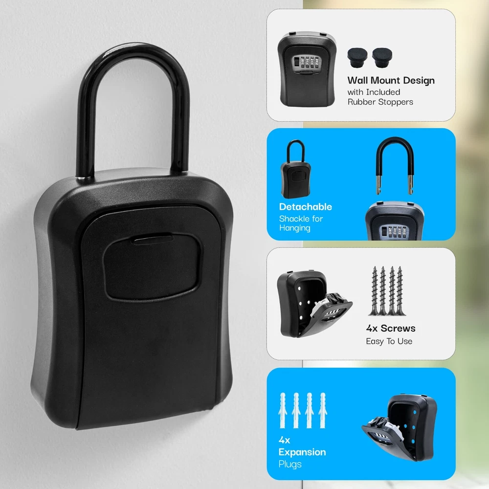 Product Description: Keep your keys safe and accessible with our ABS Lock Box, perfect for hanging or wall mounting. This versatile key lock box is ideal for businesses, offices, home owners, apartments, vacation rentals, rental property managers, realtors, and even for kids. An easy to use 4-digit combination lock. Key Features: Durable ABS Construction: Made from high-quality ABS material, this lock box offers excellent strength and weather resistance, ensuring your keys are secure in any environment. Waterproof whether it's wall mounted or hanging. Hanging or Wall Mountable: Easily mount this lock box on a wall or hang it in a convenient location, providing flexibility for various settings. The shackle is removable and each lock comes with two rubber stoppers if you decide to mount the key box on a wall. Spacious Interior: The roomy interior can hold multiple keys, making it perfect for storing spare keys for your office, home, or rental property. Secure Locking Mechanism: Equipped with a robust locking mechanism, it ensures only authorized individuals have access to the keys. Versatile Use: Ideal for businesses, offices, homes, apartments, vacation rentals, and kids, this lock box provides a reliable solution for key storage and management. Outdoor use, real estate, Airbnb, emergency access, secure key storage. Why Choose Our ABS Lock Box? Peace of Mind: Keep your spare keys stored and secure. Accessible only to those who need them. Convenience: Easily manage access to your property without the hassle of distributing multiple keys. Safety: Ensure your keys are stored in a secure, tamper-resistant lock box. ABS: Weather resistant, water resistant, and UV resistant. This lock is meant for use in all conditions, indoor or outdoor. Upgrade your key storage solution with our lockbox, and experience the perfect blend of security, durability, and convenience.