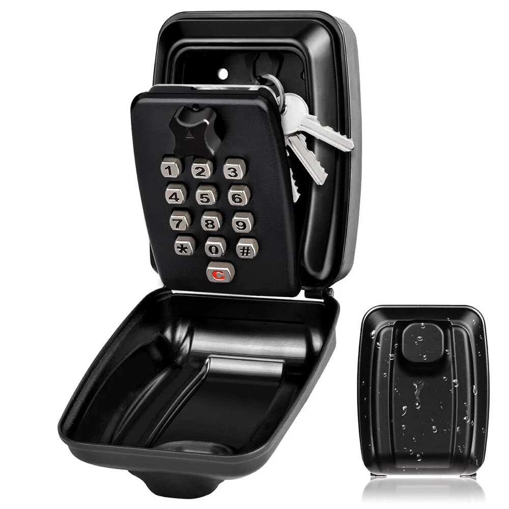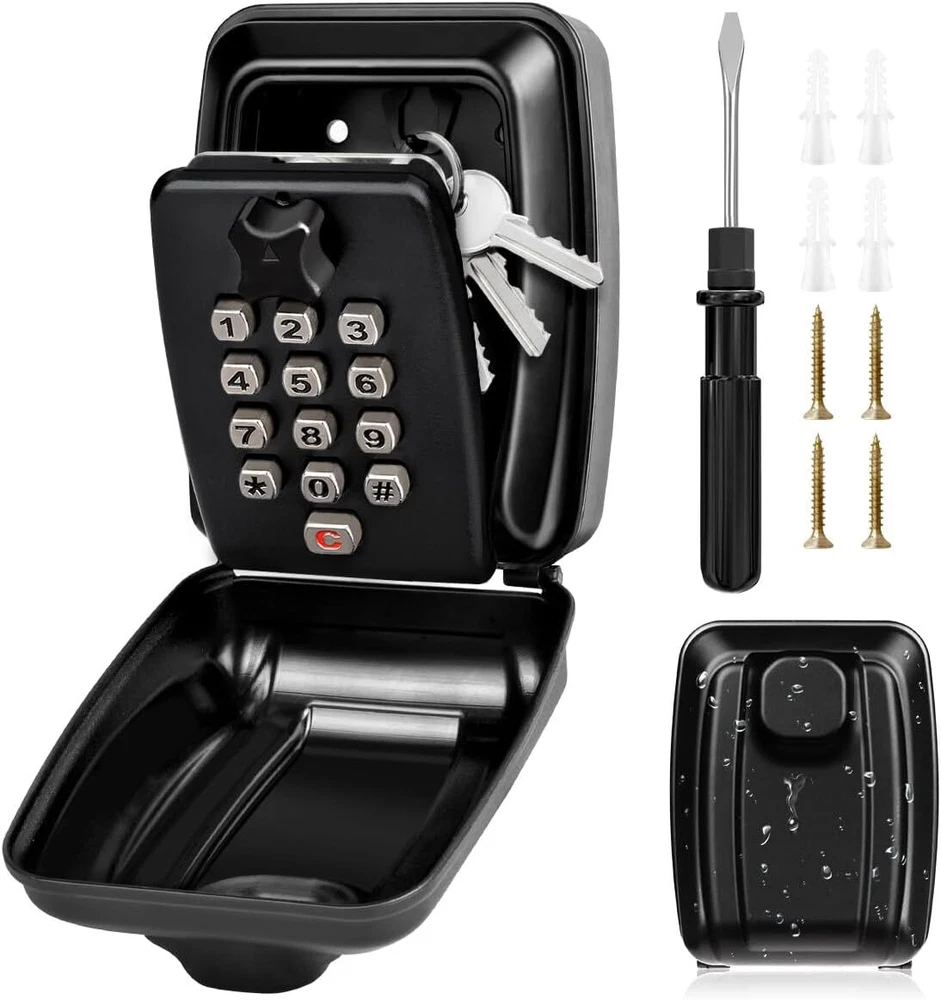 About this item 【HIGH SECURITY】- Key lock box can be set with a code of 1-12 digits at will. Provides more combination possibilities than many general 4-digit passwords on the market, so it’s harder to crack and has higher security. 【STURDY & DURABLE】- The key storage box made of high-strength zinc, aluminum alloy and heavy-duty stainless-steel material, enough to withstand hammered, sawed and pried, has a long service life, keeps your key safer. 【RAINPROOF & DUSTPROOF】- The key hider lock box comes with removable cover shields and a removable hang ring, which can effectively protect from rain, snow and sun. You can securely hang this key lock box on a doorknob, fence and anywhere you want, no need to put the keys under the carpet or flower pot. Key lock box for outside suitable for indoors and outdoors, such as garage doors, wardrobes, offices and schools. 【LARGE CAPACITY】- The security lock box size: 4.76*3.78*2.44 inches, it has ample storage space, a built-in key hook, which can hold multiple keys or other small things like ID cards, access cards, car keys, etc. Perfectly for family members, realtors, current students, office staff, pet sitters. Note: This "C" button means cancel, so you can re-enter the password if you entered it incorrectly. Specification: Material: Aluminum alloy + ABS. Weight: 650g. Color: black. What do you get? 1 x security key box 1 x User manual 1 x Screwdriver 1 x Packing box