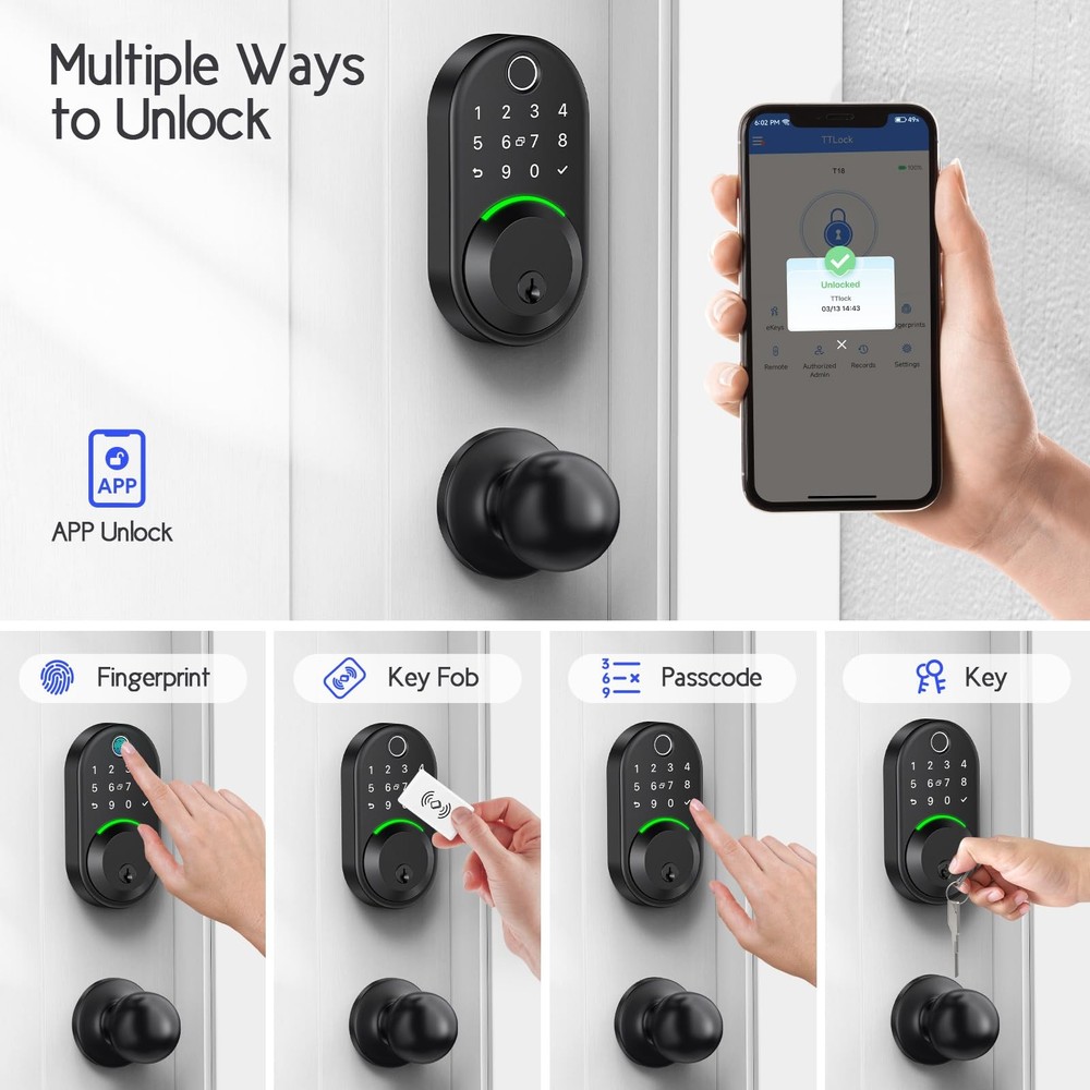 Keypad Smart Lock with Knob set,Keyless Entry Door Lock Deadbolt with Handle,Front Door Lock Set,Fingerprint Door Lock Set. Smarter and More Secure: Take control of your smart door lock with the app/PC, or use fingerprints, keypad, IC card, mechanical key, voice control,The lock is made of aluminum alloy and has been tested many times to ensure its durability and security. Remote Access: You can control and monitor the lock anytime, anywhere by connecting to the gateway (sold separately), peace of mind to you. Versatile Applications: Our products are compatible with most standard US door,it can be adapted to a variety of conditions with an IP66 waterproof rating and a temperature range from -22°F to 185°F. It's perfect for homes, hotels, apartments, offices. Easy to use: Only a screwdriver is needed to install the lock easily, while the lock provides 150 passwords, 200 fingerprints and key fob, easy to manage and use. Exceptional Customer Service: Alongside our high-quality products, we prioritize excellent after-sales service. Enjoy a 30-day money-back guarantee, a 1-year product warranty,and lifetime after-sales support.