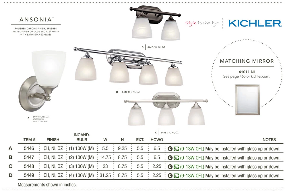 Powered by Frooition All Categories Kichler 5449 Ansonia 4 Light 31" Wide Vanity Light Bathroom Fixture with Etched Glass Shades Overview Item Description Linear and futuristic in its design, the Ansonia Collection takes simple, striking shapes to form a line of fixtures that are both delicate and ultramodern. Each piece features a clean profile with an uncluttered design suitable for any home. Features: Satin etched glass gently softens and diffuses the light. Reversible Mounting - May be installed with the glass pointed upward or downwards Covered under Kichler's 1-year limited warranty This transitional vanity lighting fixture from the Ansonia collection is available in brushed nickel, chrome, and olde bronze finishes Complete the look of your bathroom with these other items from the Ansonia Collection - see Related Items Dimensions: Height: 8.75" Width: 31.25" (measured from furthest point left to furthest point right on fixture) Product Weight: 7.1 lbs Electrical Specifications: Bulb Base: Medium (E26) Bulb Shape: A19 Number of Bulbs: 4 Bulb Included: No Watts Per Bulb: 100 Maximum Wattage: 400 watts Voltage: 120 (U.S. standard line voltage) Why Choose BuildInc? OUR PROMISE TO YOU About Us At Build, we promise to provide the best selection we can, most competitive pricing, and unmatched customer service. Our store has quality home improvement products from trusted manufacturers like Moen, American Standard, Delta, Kraus, Kichler, Progress Lighting, Schlage, Kwikset, Baldwin, Broan, NuTone, Air King, and Rev-A-Shelf. With over 200,000 home improvement products for you to choose from, we have just what you need to get your project done. Fast & Free Shipping We promise to make it our priority to get you your items as fast as we can. We ship from 440 warehouses around the country, ensuring that your product will get to you as soon as possible. We know you're eager to get your hands on your new purchase, we would be too. As a bonus, most items ship for free. Returns We are happy to accept returns of unused or defective items for a refund within 30 days from the date of delivery. For returns outside 30 days, please contact our Customer Service team to go over our options. For full details, please view the Shipping and Payments tab above. To initiate a return simply go to the eBay Returns Portal and submit a return request. We ask that all items be returned with all original components via a traceable method. Once your return is received and processed, we will quickly get your refund or replacement issued. If for any reason you are unsatisfied with your purchase or for product or warranty questions, please contact Customer Service team for assistance. More Items! View more great items! About Us | Shipping | Returns | Contact Us | FAQ | Collections | Special Offers! Powered by Frooition Frooition Frooition | No-js Template | eBay design, eBay store design, eBay shop design, eBay template design, eBay listing design (ver:froo_no_js) This listing is currently undergoing maintenance, we apologize for any inconvenience caused.