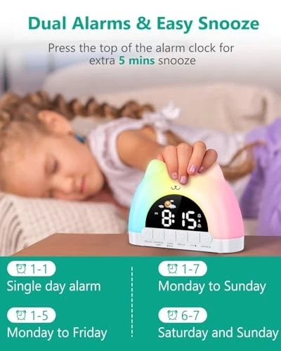 Return Policy Fast Delivery Trusted seller Kids Alarm Clock, OK to Wake Clock for Kids, Toddler Sleep Training Clock with 11 RGB Night Lights, Dual Alarms, 5-Level Brightness, 4-Level Volume, for Girls Boys Teens Product Description Sleep Reminder & Wake-up Function: This kids alarm clock has symbols and light reminders. After enabling the "Sun/Moon" icon, the atmosp light (default: red) will automatically turn on at the sleep time you set and automatically turn off one hour later to coax your child to sleep. In the morning, the atmosp light (default: yellow) will turn on 20 minutes before the alarm time you set. When the alarm goes off, the ambient light will turn green (fixed color) to wake up the child. Children's Night Light Companion: This ok to wake clock has an atmosp light function that can be easily activated by simply touching the top in time display mode. It offers 11 color modes and adjusts its brightness in 3 levels of high, medium and low, which can create a warm and comfortable atmosp, so that children are not afraid to sleep alone in the dark. Child Lock Function & Music Playback: After the child lock is on, all buttons on the product will be locked, children can only control the snooze button, switch and enjoy 10 music tracks, and adjust the ambient light color. This feature prevents accidental changes to important settings such as time and alarm. Dual Alarms with Customizable Settings: The sleep training clock is equipped with 2 independent alarms and provides 4 weekday alarm settings: single day, Monday to Friday, Monday to Sunday, and Saturday to Sunday. Choose from 12 different wake-up sounds, each with 4 volume levels, to customize your morning routine. The snooze function provides an extra 5 minutes of rest. Plug-in Use & Memory Function: The bedside alarm clock must be plugged in (Type-C charging cable included), and t are 5 brightness levels to choose from, with the final level turning off the screen for a resting state. At the same time, it has a memory function, as long as the button battery is installed, the time setting can be retained even if the device is turned off or powered off. Multi-function & Super Practical: The children's ambient light clock also supports 12/24H format switching, can be set to night mode, and the built-in USB output port can also be used as a charging station for other small electronic devices. These designs make it a comprehensive and user-friendly solution in daily life. Shipping Returns Payment Shipping Shipping is FREE to all addresses other than APO/PO boxes in the lower 48 states. All our stock ships from US-based warehouses. Shipped via USPS or UPS (depending on location and package weight) Unless stated otherwise, all orders will ship within 24-72 hours of your payment being processed. Check our feedback to see the great reviews of FAST shipping we offer. Returns Seller does not accept returns Payment We currently accept payment via eBay managed payments only. Once payment is cleared, we will dispatch your shipment within 1-3 business days. Please refer to the "Shipping" tab for more information regarding shipping speed to your destination.