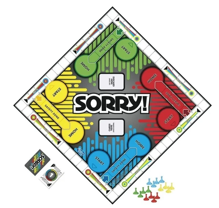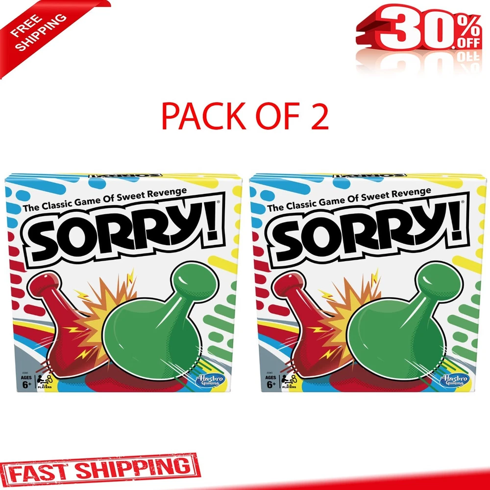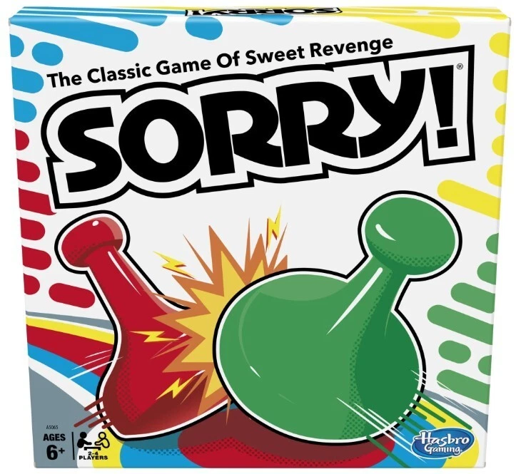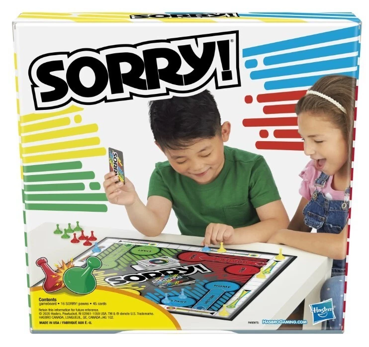 Kids Board Game, Family Board Games for Kids, 2 to 4 Players, Ages 6+, Plastic. Product details Sorry! Kids Board Game, Family Board Games for Kids, 2 to 4 Players, Ages 6+ Slide, collide and score to win the Sorry! game! Who knows what will happen next as players chase their opponents around the board, trying to get their 3 pawns from start to home first? Will a player draw a card that tells them to move ahead 2 spaces or back 6? Will someone land on a slide or will an opponent land on a player's space, sending them back to the start? This iconic children's game is a great choice for game nights and one of the best indoor games for kids. Kids board games like Sorry! make great family gifts for 8 year old boys and girls and up. Add this family board game for kids to your next Family Game Night! Hasbro Gaming and all related terms are trademarks of Hasbro. Includes gameboard, 12 Sorry! pawns, 45 cards, and instructions. Ages 6 and up. For 2 to 4 players. © 2022 Hasbro. All rights reserved. GAME OF SWEET REVENGE: Enjoy classic Sorry! gameplay with this Sorry! board game for kids. It's an edge-of-your-seat race to home, so hurry up and get there first FIRST ONE HOME WINS: Who will be the first player to get all 3 of their pawns to the home space? But watch out! Players can get "sweet revenge" by sending each other's pawns back to the starting point SO MANY POSSIBILITIES: Slide, collide, and score to win the Sorry! game. This family game for kids and adults features so many possibilities depending on the card picked up and strategy chosen CLASSIC SORRY! GAMEPLAY: Remember playing the original Sorry! game as a kid? Bring back memories of playing the Sorry! game with family members and introduce it to a new generation FAMILY GAME NIGHT FAVORITE: A go-to game for family time or anytime indoor fun, the Sorry! game for kids is one of the best family games for game night GREAT GIFTS FOR GIRLS AND BOYS: Classic board games make entertaining family gifts for kids ages 6 and up who love group games CHRISTMAS GIFTS FOR KIDS: This kids board game is a fantastic choice for holiday games and gifts under $10, making it perfect for Secret Santa and White Elephant gift exchanges