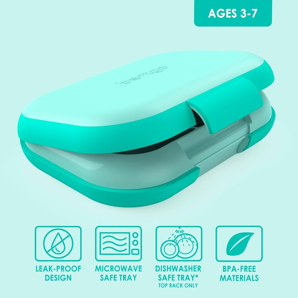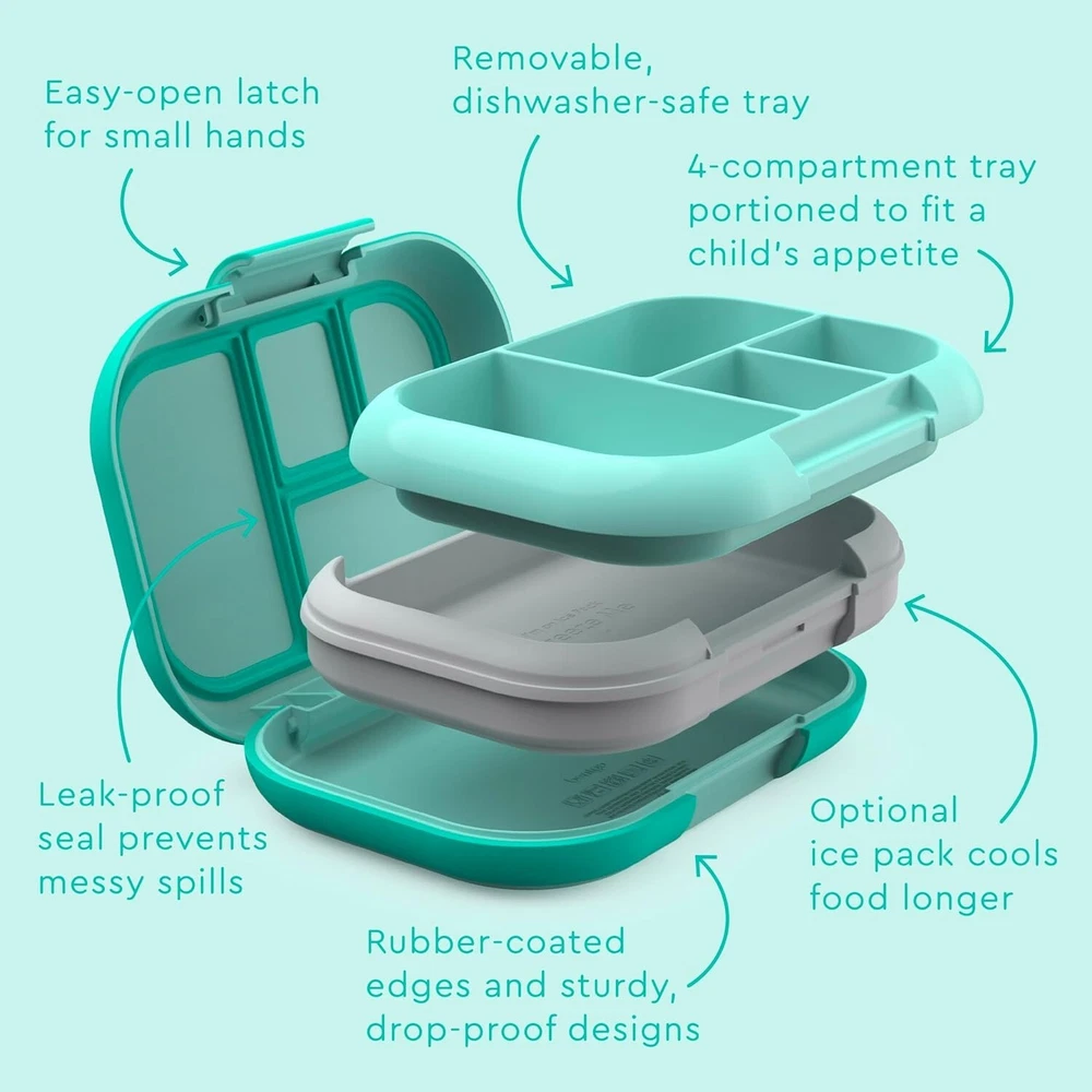 Kids Chill Leak-Proof Lunch Box - Included Reusable Ice Pack Keeps Food Cold; 4-Compartment Bento Lunch Container; Microwave/Dishwasher Safe; 2 Manufacturer's Aqua Keeps Lunches Cool: No need to buy extra ice packs! Our lightweight and reusable bento lunch box for kids has a patented design with a removable ice pack to keep food cool longer. Simply pop the ice pack into the freezer the night before and add it underneath the lunch box tray when your kids are ready to get out the door. Plus, our industry-leading 2- manufacturer’s satisfaction protects your purchase for long-lasting use. Number One Lunch Box product: This durable bento box comes from America’s favorite, award-winning product that’s designed to make mealtime fun. Kids Chill is made of eco-friendly, BPA-free materials that are safe for children and is recommended for toddlers and kids ages 3-7. The 4-compartment tray holds a total of 3 ⅓ cups and is great for picky eaters, as it keeps everything separated and allows parents to pack a variety of food for versatile lunch options! Leak-Proof Technology: Meals and snacks stay fresh and mess-free from kitchen to class to after-school activities. One kid-friendly latch makes it easy for small hands to open and close while enjoying their lunch during school, camp, or daycare. Plus, the durable outer shell has a rubberized edge to resist drops and cracks; making it ideal for active kids on the go! Easy To Clean, Heat, & Pack: Our reusable lunch container has a removable tray that is safe for both the top rack of the dishwasher and the microwave. For best results, we recommend hand washing the main container and ice pack. Purchase With a Purpose: continues to be a proud supporter of Feed the Children, a 501(c)(3) nonprofit that gives hope and resources for hungry children and families. Since 2017, has donated nearly $300,000 to help put an end to hunger.