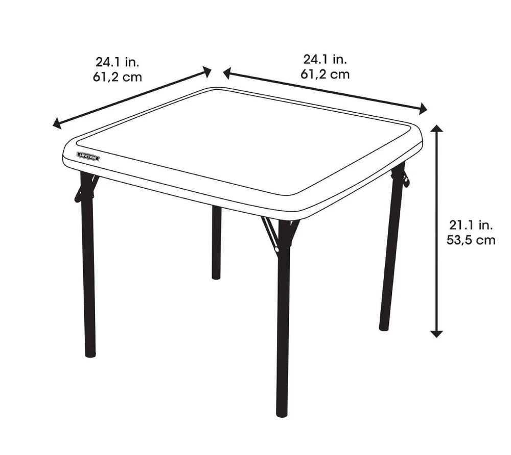 Constructed of High Density Polyethylene for superior strength and durability; Backed by a 1-year limited manufacturer Lightweight design; Designed for children ages 3-9. Rust-resistant powder-coated Steel frame Uv-protected top is stain resistant and easy to clean Folds flat for easy storage and transportation; open dimensions- 24" L x 24" w x 21" H; closed - 24 in. W x 24 in. D x 2 in. H All-weather resistant; designed for indoor and outdoor use