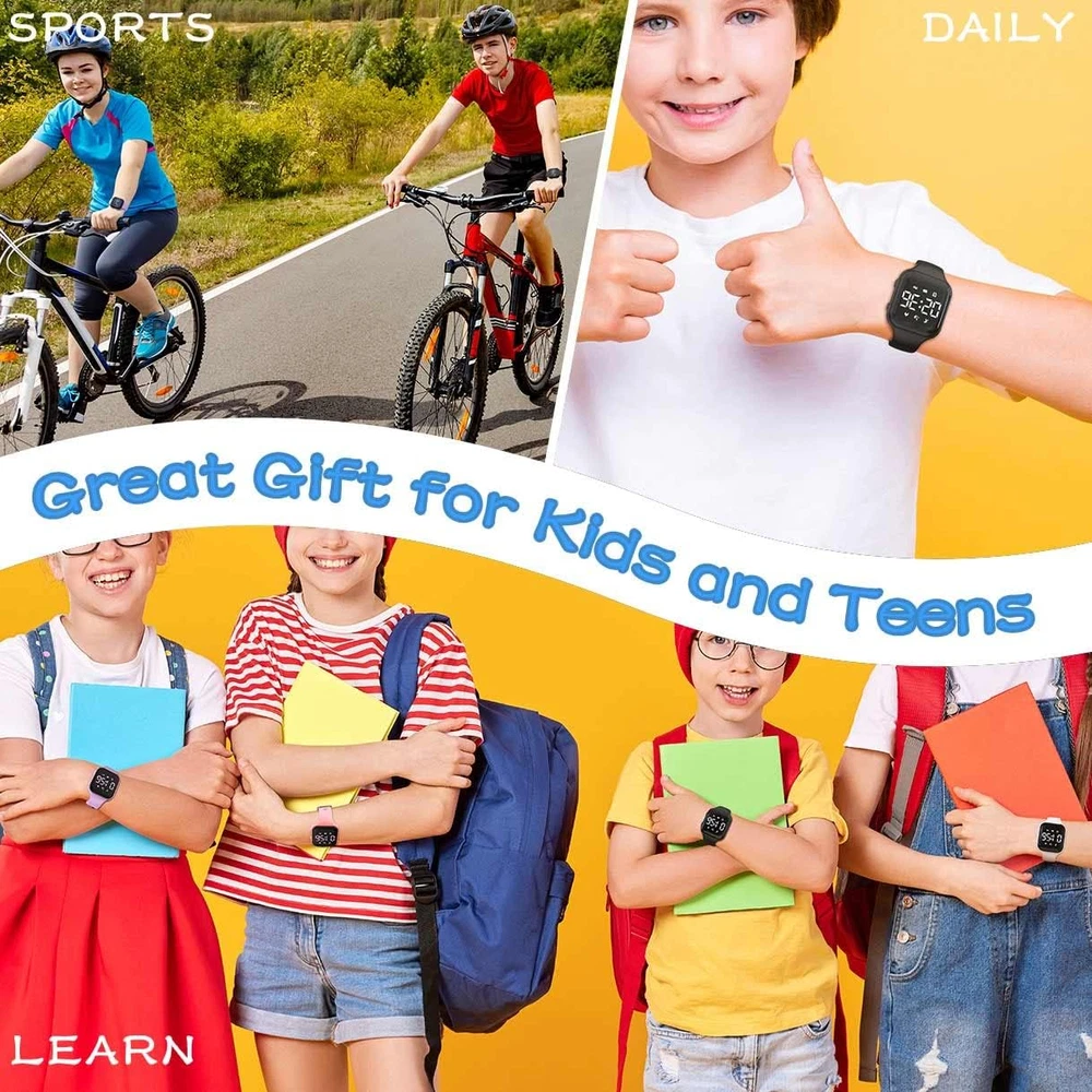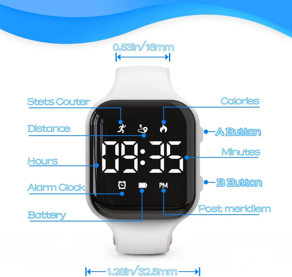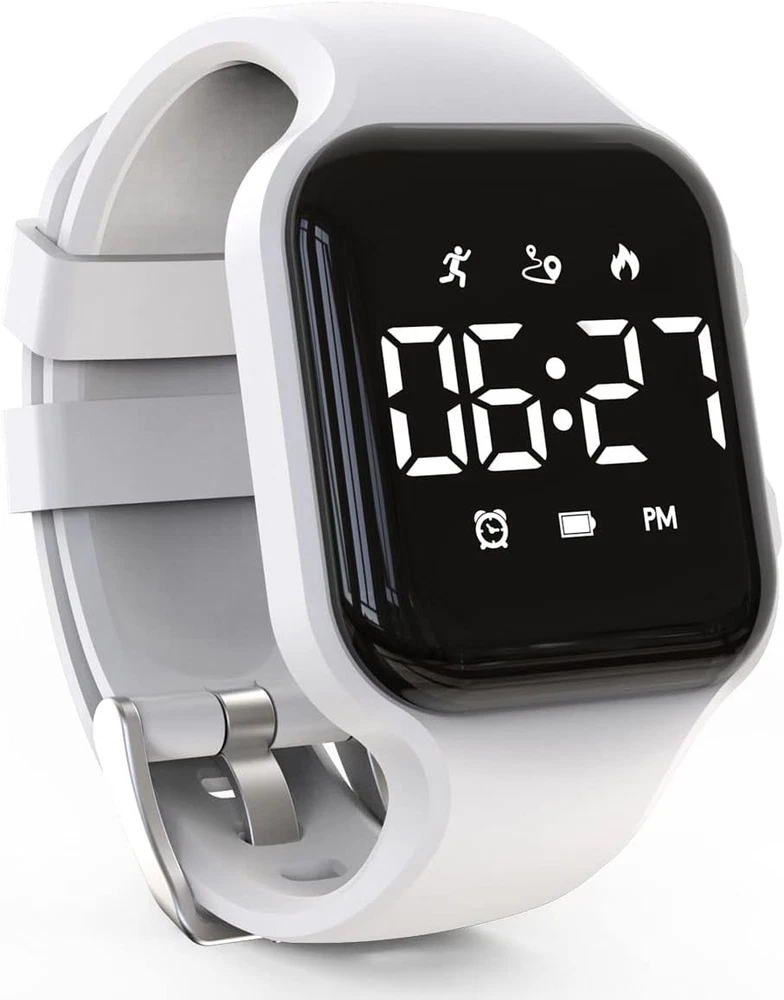 【Design for kids 】: The style and size of the watch are specially designed for kids and teens(NOTE: Recommended age as Above 6 years), and the watch strap is made of food-grade silicone, which is soft and skin-friendly and comfortable to wear; It will be a great gift from a parent to a child, a grandparent to a grandchild. 【Multifunction Steps Counting Watch】: Built-in 3D three-axis sensor, it will accurately track all-day activities including steps, distance, calories burned; Sports function will increase children's interest; And don't need to connect smartphone or APP. 【Easy to Use】: Abandon complicated functions and operations; after setting the time, even children can easily operate. 【long battery life watch】: The watch has a built-in USB charging head for easy charging; After a full charge, the watch can be used for 15-20 days. 【Purchase Without Worry 】: Worry-free 12- month warranty; If you have any questions about the product, please feel free to contact seller, we will provide warranty service and give you a satisfactory solution. Product Description Simple Pedometer Watch, Great for teen boys, girls and Children Designed for Kids Specially designed for children and adolescents; with vivid colors and comfortable wearing experience. IP67 Waterproof Meet the daily waterproof needs, support wearing the watch to wash hands and cold shower , but please don't wear the watch for swimming and bathing. Cool LED Display Creative LED display, clear and bright. Easy to Charge Built-in USB charging head, supports charging the watch with USB charging ports such as mobile phone adapters, PC, power banks, etc. Comfortable to Wear The watch strap is a soft food-grade silicone strap that is comfortable to wear. Easy to Use Abandon complicated functions and operations, after setting the time, children can use it simply and easily. It will be a great gift from parents to a child, grandparents to a grandchild.