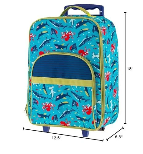 Description The perfect kids rolling luggage doesn’t exis.... NOW IT DOES! We designed our new rolling luggage so it’s easy for your kiddo AND for you to roll (because we all know it’s going to happen!). We added 2 compartments to make sure you stay organized, threw in a big outer pocket, and chose durable wheels to keep you cruising in style. What can we say, we thought of everything! Details Two compartments and large outer pocket Extendable handle Ideal height for little travelers Carry-on luggage size Several unique prints available Dimensions Approx. 12.5" x 6.5" x 18" Fun Shark Design: This kids' luggage features a playful shark design that adds excitement to your child's travel adventures. Durable and Sturdy: Constructed from high-quality materials, this luggage is built to withstand the rigors of travel, ensuring it lasts trip after trip. Spacious Interior: Offers ample storage space with multiple compartments, making it easy to organize and access your child's belongings. Easy to Transport: Equipped with smooth-rolling wheels and a retractable handle, this luggage is designed for effortless maneuverability, perfect for young travelers. is recognized for producing high-quality children’s products in on-trend patterns. Best known for their back-to-school gear, raincoats, boots, and umbrellas, plus a “Summer Fun” collection of beach and poolside gear. They are now also a beloved brand in the world of baby products and creative games and toys for kids of all ages.