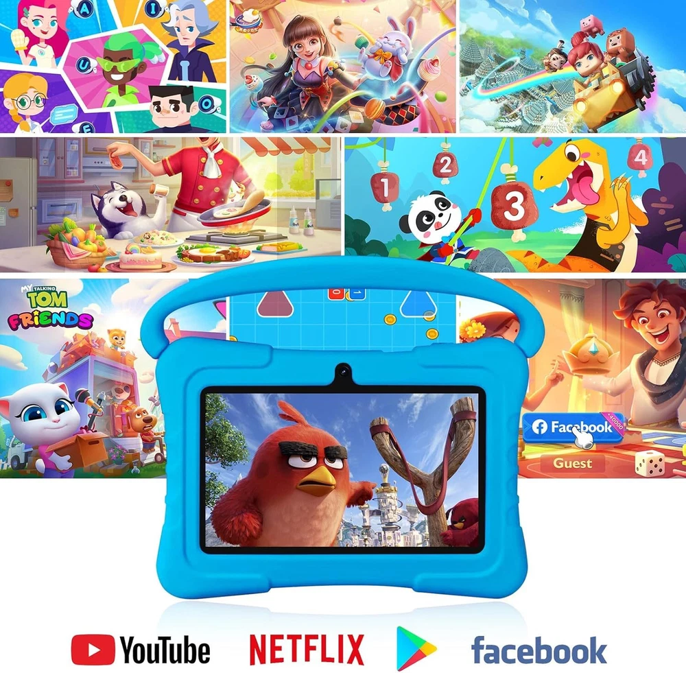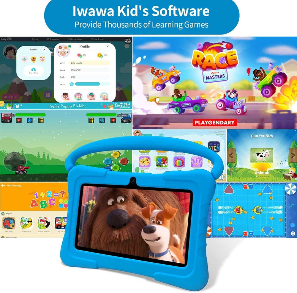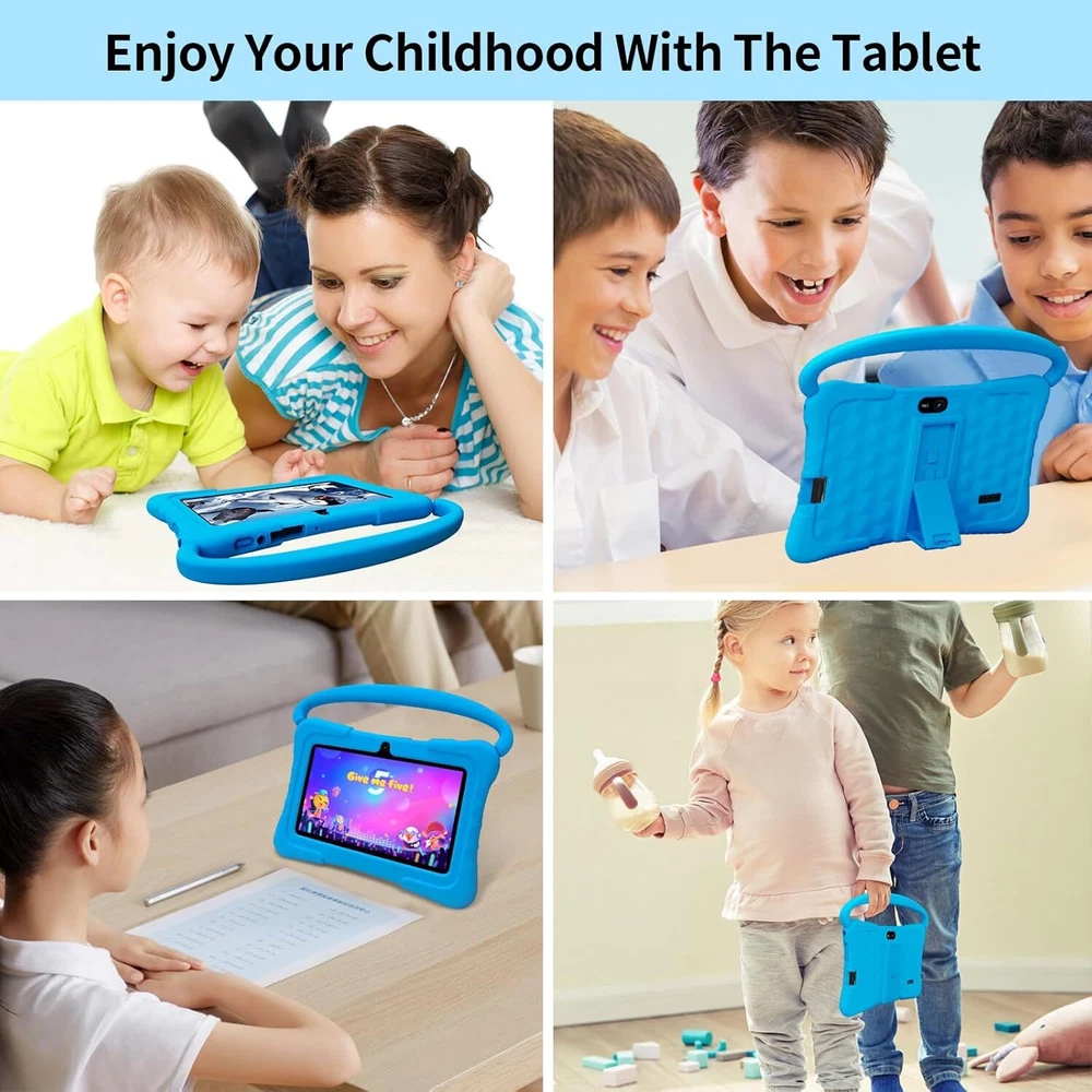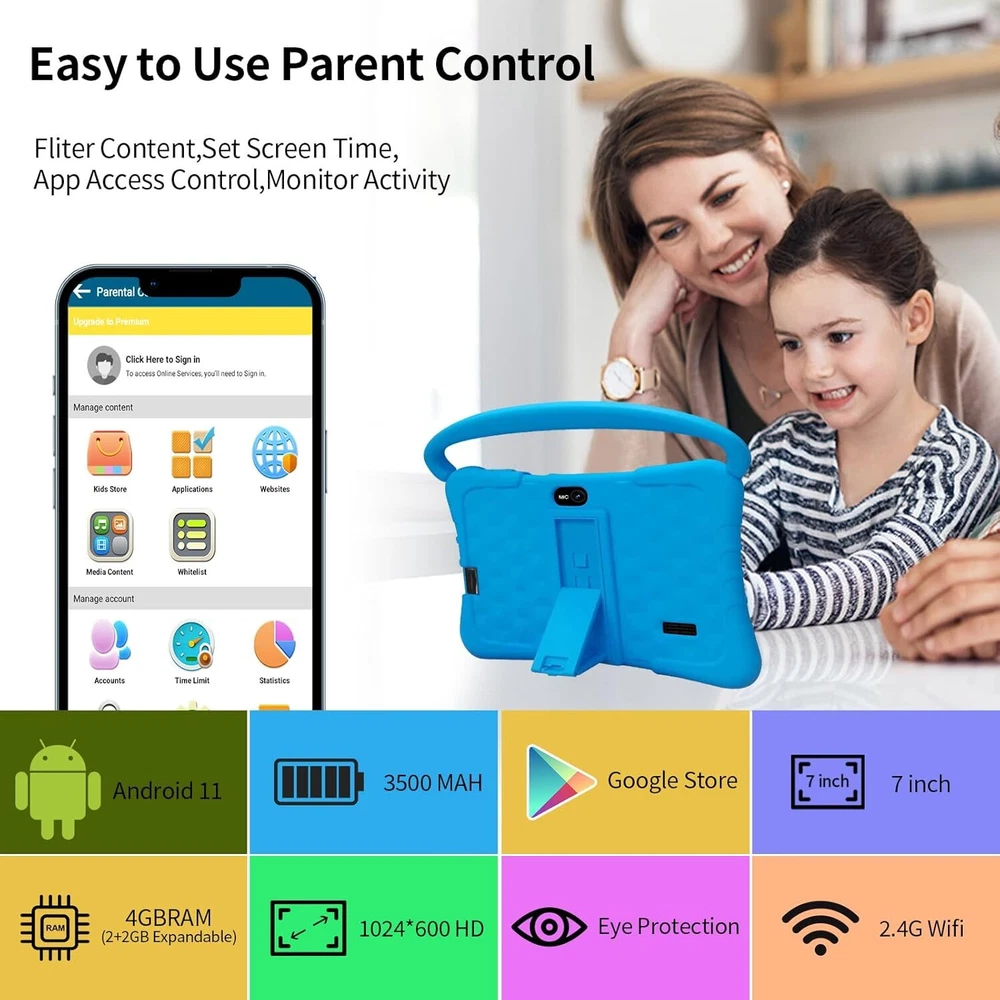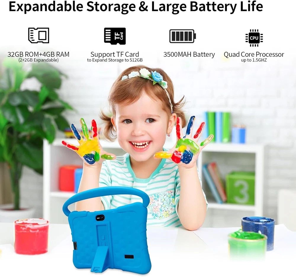 Kids Tablet 7 Inch for Toddlers,4GB(2+2Expand) RAM 32GB Blue Product Details Standing screen display size: 7 Inches Screen Resolution: 1024x600 Max Screen Resolution: 1024*600 Pixels Processor: 1.5 GHz RAM: 2 GB Chipset Brand: ARM Card Description: Integrated Wireless Type: Bluetooth Average Battery Life (in hours): 4 Hours Brand: NEWISION Model Name: K7 Memory Storage Capacity: 2 GB Screen Size: 7 Inches Display Resolution Maximum: 1024*600 Pixels 【7-inch Kids Tablet】Android tablet is designed to enhance your child's learning,reading and entertaining experience.With 1.5GHz Quad-Core processor and 4GB RAM,this tablet offers seamless performance and responsiveness for running educational apps and playing light games.Moreover,the tablet comes with 32GB of internal storage,and its sd card expandable up to an additional 512GB,providing ample space for storing books,videos,and educational content. 【Pre-installed Parental Control】Utilizing the pre-installed iwawa app or family link, parents can set time limits,effectively managing your child's screen time and avoiding excessive use. The app also provides insights into your child's activities,helping you monitor their app usage and ensuring they engage in productive and educational content,including educational games, kid's learning materials,art and craft activities,and captivating video shows. 【Kids Tablet with a Durable Handheld Case】The tablet case is designed to provide maximum protection against drops, dust, and bumps. The included silicone case not only safeguards the tablet but also features an adjustable stand on the back, allowing children to go hands-free while watching videos, video chatting, or listening to music. With its portable design, kids can take the tablet anywhere they go, whether it's hanging from a lanyard, in the car, or outdoors. 【Great Gift For Children】It's the perfect gift and companion for children above 3 years old. It comes preloaded with a variety of educational apps tailored to your child's age and skill level. These apps cover a wide range of subjects, including animals, clothing types, fruit varieties, typing, and drawing, stimulating your child's imagination and creativity,good for Children's Day, Summer Holidays, Christmas, New Year, Easter, or your child's birthday. 【Featuring an Eye Protection Screen】Our 7-inch Toddler Tablet provides a display with a resolution of 1024x600. The screen incorporates low blue light technology and offers easy access to the "Eye Comfort" and "Reading Mode" options with just one click. By utilizing these features, the tablet helps prevent digital eye strain, headaches, sleep issues, fatigue, and more. Kids can enjoy their tablet experience with comfort and ease, ensuring a healthier visual experience.