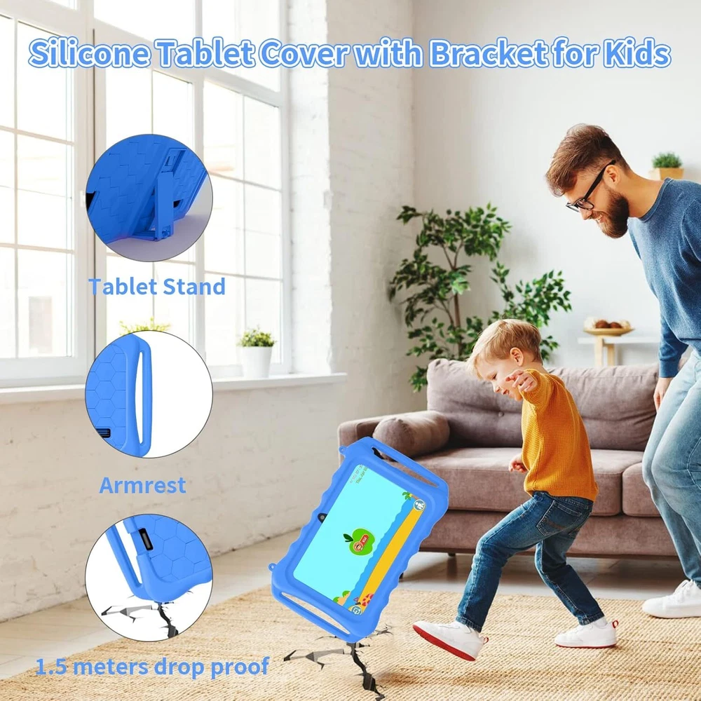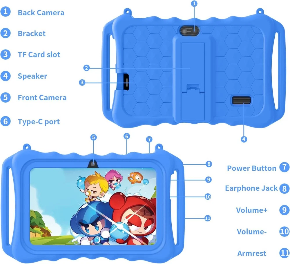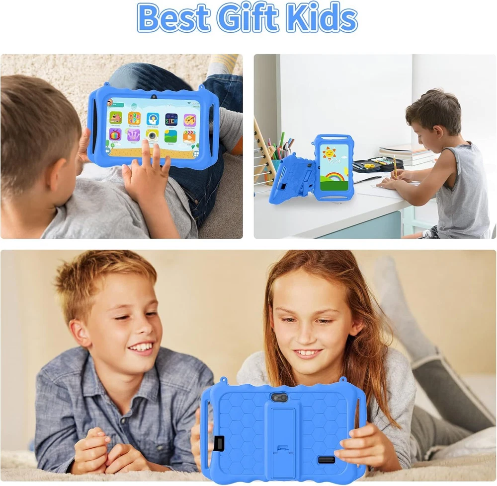 Kids Tablet, 7 inch Android 11 Tablet for Kids, 6GB(2+4) RAM 32GB ROM Blue Product Details Brand: aiprotablet Model Name: N07 Memory Storage Capacity: 32 GB Screen Size: 7 Inches Display Resolution Maximum: 1024x600 Pixels Full-Featured Kid-Safe Tablet - The kid's tablet runs the latest Android 11 operating system and supports Wi-Fi 2.4GHZ , a new WiFi transceiver channel that improves the speed and stability of network connection. Includes dual speakers, Bluetooth 4.2, FM radio for online learning and video calls. More features for fun and productivity. Parental Control Mode - This 7-inch tablet for kids offers a user-friendly interface and comes pre-loaded with the iWaWa app and games for kids to learn and play with. With comprehensive parental controls, you can easily manage your child's screen time, set educational goals, and as your child grows, these Settings can be adjusted for their age. Dual Cameras + Friendly design - The Android 11 tablet has dual built-in cameras with a 2.0 MP front camera and a 2.0MP rear camera. Specially designed kid-friendly shock-proof strap holder case made of soft silicone material to protect your children's tablet from scratches, dust, bumps and drops. Children don't have to hold tablets all the time while studying, watching and playing games. Storage and Eye Care - Children's tablet dedicated to children's eye care HD 1024*600 IPS screen resolution, wide viewing angle provides a more realistic viewing experience. Reduce eye fatigue and protect eyesight. With a powerful quad-core CPU, 6GB(2+4) RAM, 32GB ROM storage (expandable up to 128GB), and easy multitasking.