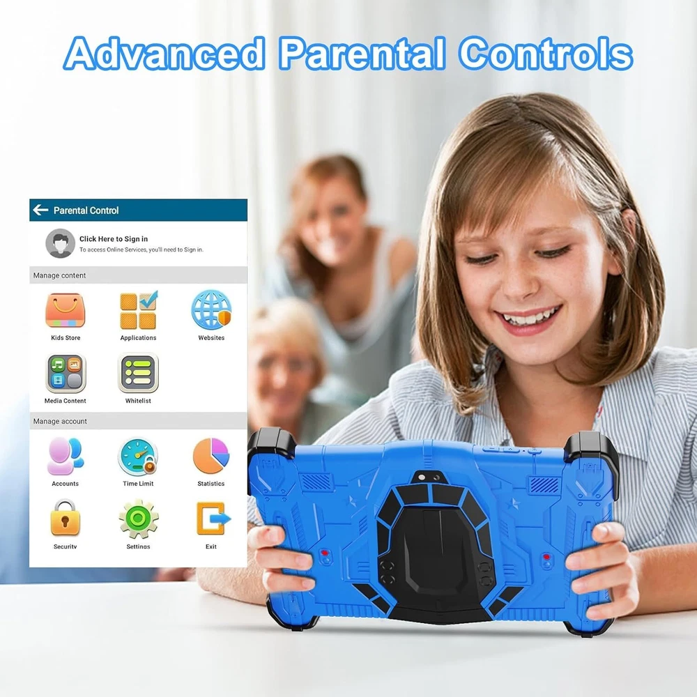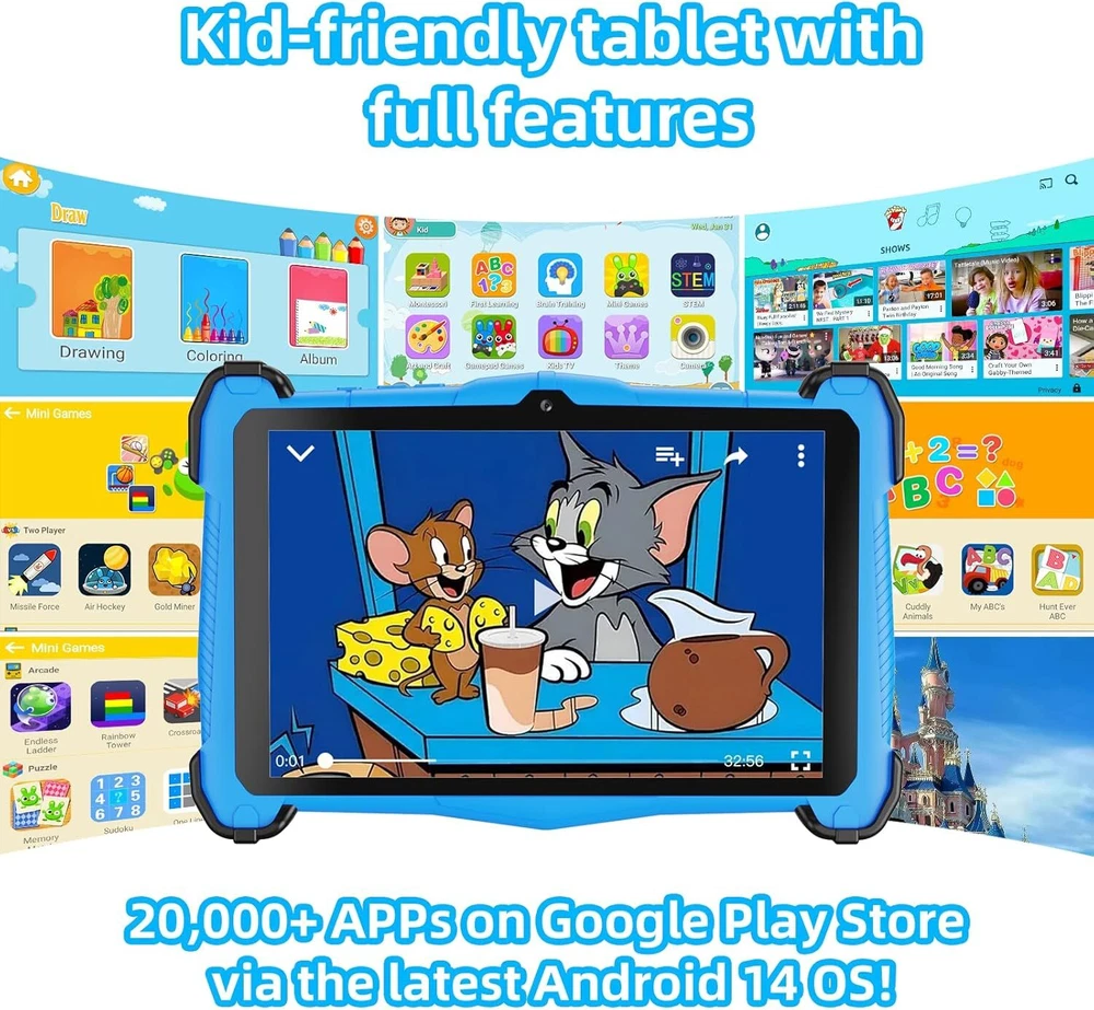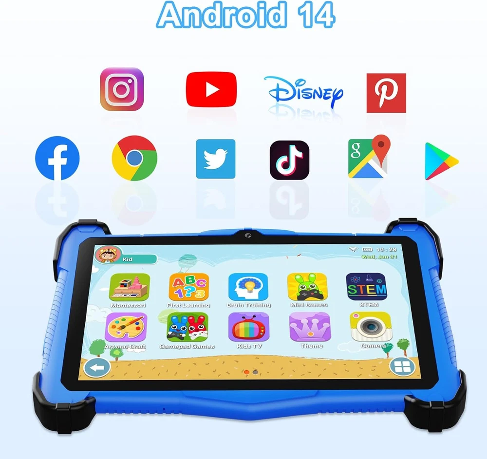 Kids Tablet 7 inch, Upgraded Android 14 for With Shockproof Blue Product Details Standing screen display size: 7 Inches Screen Resolution: 1024x600 Max Screen Resolution: 1024*600 Pixels Card Description: Integrated Brand: Fivahiva Model Name: F_764 Memory Storage Capacity: 10 GB Screen Size: 7 Inches Display Resolution Maximum: 1024*600 Pixels Powerful Performance: The Kids Tablet features an advanced Android 14 OS, powered by a robust octa-core CPU and 10GB of RAM, ensuring smooth app launches and enhanced responsiveness for an enjoyable experience for kids ages 2-14. Curated Educational Content: Preloaded with age-appropriate learning, education, and entertainment apps, our tablet for kids allows children to explore curated iWawa content, fostering creativity and knowledge in a fun, interactive way. Customizable Parental Controls: Enjoy peace of mind with our no-hassle parental controls that let you filter content based on age, set educational goals, and limit screen time, while keeping kids free from social media and in-app purchases without your approval. Seamless Connectivity: Equipped with Bluetooth 5.0 and Wi-Fi 6, this kids tablet provides fast and reliable connections for streaming educational videos, accessing online content, or connecting with family via apps like Zoom. Optimized Storage and Expandability: With 64GB of internal storage, there’s plenty of space for thousands of apps, games, and videos, making this tablet the perfect learning tool for kids ages 6-12. Effortlessly add more content as your child grows, ensuring continued engagement and discovery. Perfect Gift: Our tablet is perfect for any occasion, whether for work, study, entertainment, or productivity. Lightweight and portable, it supports touch operation and offers a variety of entertainment and educational features. The package includes a tablet, Type-C cable, charger, and user manual.