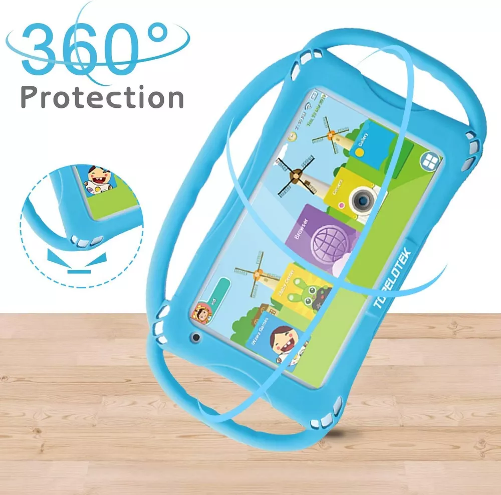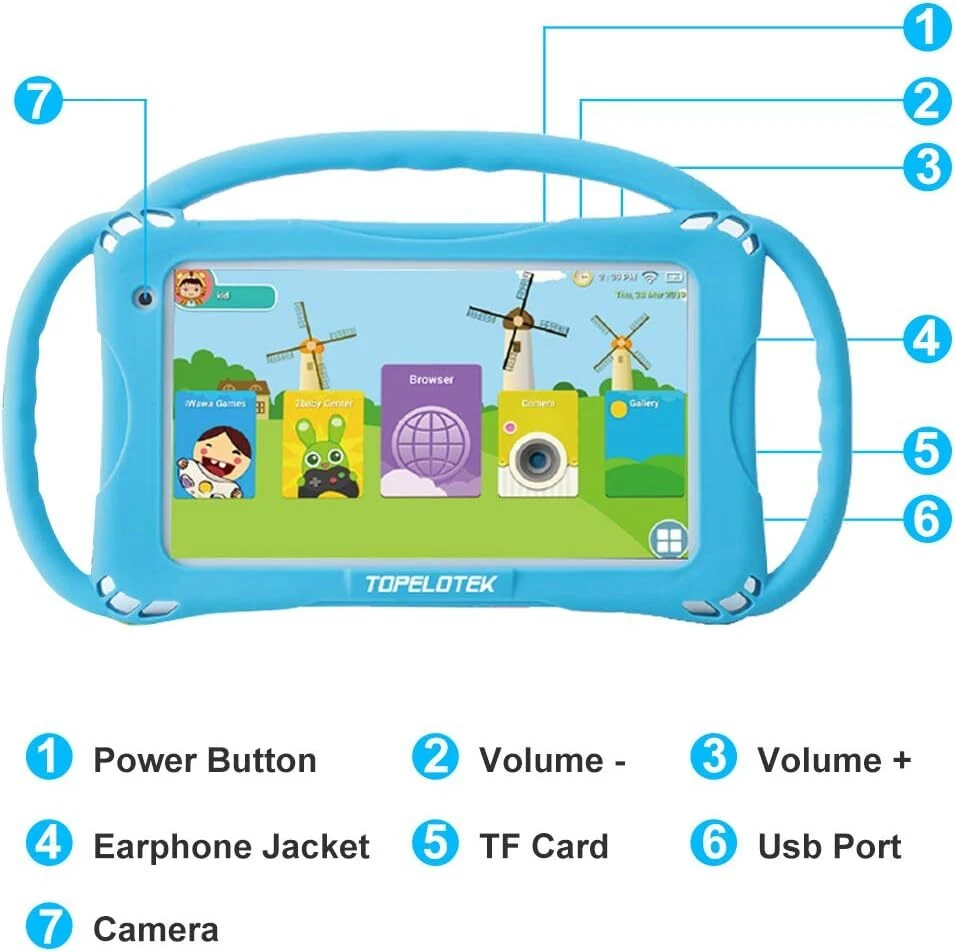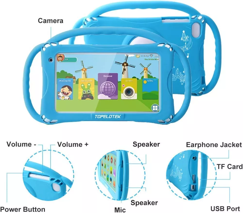 Kids Tablet 7inch Android Toddler 32GB APP 32GB, Blue Product Details ★[FREE KIDS APPS & GAMES] - Topelotek Kids Tablet comes with a safe and funny iWawa Kid's software free pre-installed apps for Kids learning & playing, free kids app in the kids store, you can download different apps from the Google Play store. An ideal gift for birthday, Christmas, holiday season for kids or yourself. ★[BEST KID-FRIENDLY COMPANION] - Our tablets for kids with kid Mode,the Child-Friendly Interface makes it easy to use. Tablet offers access to a range of age- appropriate and up to date fun content including games, videos,paintings and educational apps. In their key stage of developing abilities of the brain, children can see, listen, feel and observe the world through the tablet.Supporting 38 languages, including Spanish, every kid can play on it. ★[FANTASTIC EXPERIENCE] - The kids edition tablet has a built-in high-performance quad-core processor and Android 9.0 OS, 1024x600 IPS HD display, Wifi, Bluetooth, dual camera, touch screen, 1GB RAM and 32GB ROM.You can expand the storage to 64 GB of SD cards for storing photos, music and videos with additional micro SD card extensions. A more stable Wifi module and a durable battery give you a better experience. ★[GREAT FOR KIDS] -With parental control mode, you can create and customize profiles for kids’accounts, hand-pick content for your kids, control screen time and ensure they are browsing safe websites. These security settings can be adjusted as kids grow with content tailored to their age. ★[WELL-DESIGNED KID-PROOF CASE] - The specially designed case protects your kid's tablet against dust, bumps and drops. At the same time, all the features are accessible with precise cut-outs of ports, cameras. A colorful and Stable stand on the back of case allows toddlers to go hands-free for watching videos and video chatting. Tablet for kids Tech Specification: Model: TOPELOTEK kids708/709 kids tablet Display:7“HD display kids tablet Resolution:1024×600 kids tablet Operating System: Android 10.0 Tablet Storage:32GB (expandable by up to 64GB) CPU & RAM:Quad-core 1.5GHz with 1GB of RAM Kids tablet Ports:Type-C Kids tablet Camera:0.3+2.0 MP camera Content:Thousands of movies, TV episodes, books, eduacational apps, games, and more in iwawa App Store and Google Play Store Kids tablet Connectivity:2.4 GHz Wi-Fi (802.11 b/g/n) Bluetooth Version:4.0 Tablet for Kids Battery: 3500mAh Toddler tablet Interface: 1* 5V/2A Power Supply 1* Volume Key 1* Power Button 1* Type-C Port 1* TF Card Slot 1* Headphone Connector Tablet for Kids Gift Set Packaging: 1*Kids tablets + Tons of kids learning apps 1*Kids tablets charger 1*toddler tablet case 1*Tablet for kids 3-7 Type-C Cable 1*Tablet for kids 3-7 User Manual