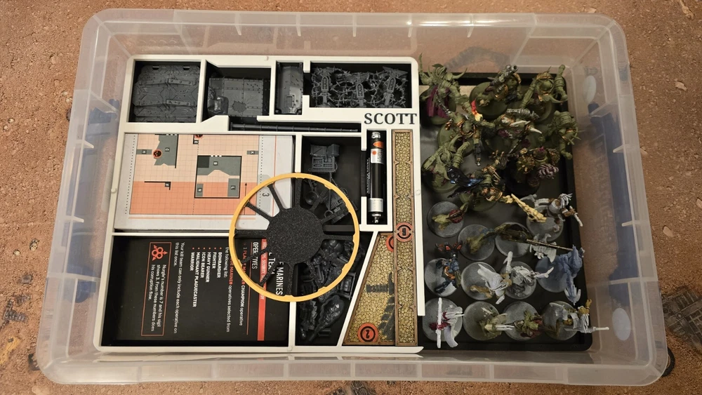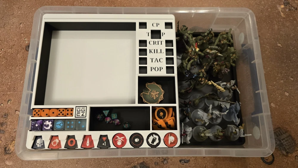 This item is perfect for any Kill Team player that wants to only take one box that carries everything they need. This will fit inside the 4L Really Useful Box so that you use the remaining space for your Kill Team whilst the box will house everything else needed to play a game, with the exception of the terrain. This box will fit all the tokens that are come bundled with the Kill Team Starter Set as well as all the equipment in the Kill Team Equipment upgrade pack. The bottom has two slots that fit tarot sized kill team cards. Both with and without sleeves. There is also a circle cut out for large custom objective markers. There are several extra spaces for whatever else you may wish to include. I also include a removable card divider if you wish to fit more cards in the dice tray. It may also fit in other boxes that are designed for A4 paper but please check the below dimensions of the box with the Support bar that stops the box from sliding. Box - L:215 W:220 H:65 Box with Support Bar - L:215 W:348 H:65 The support bar will come in two pieces that you will need to push together, then slide into the opposite corners of your Really Useful Box. This does not come with any items that are inside the token box. The current items in there are for display purposes to show what goes in. You will also need to obtain your own Really Useful Box, preferably with ferrous sheets, so your models can use magnets to stick in the box. I do not recommend magnetic sheets as they do not generate a strong pull for other magnets, where ferrous sheets do even though they aren't magnetic themselves. This box is 3D printed, and small visual imperfections may occur with your print. Please make sure to thoroughly test your the printed box in your Really Useful box with the U bar to make sure it doesn't slide before you put any models in.