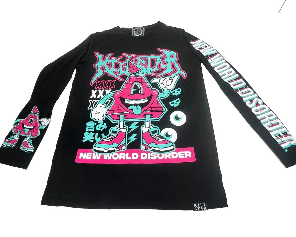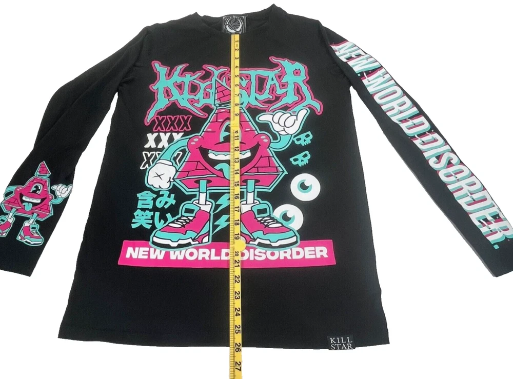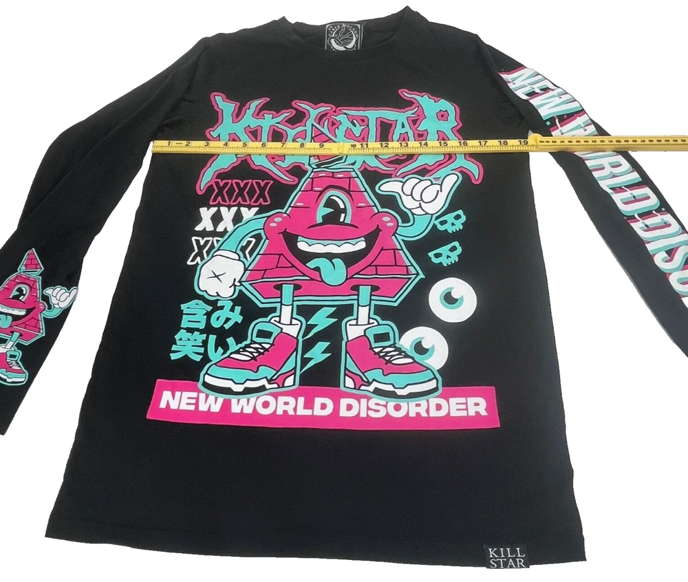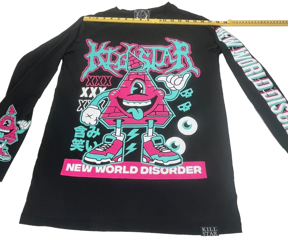 Killstar Graphic Metal Tee New World Disorder Pyramid Black Long Sleeve Print M Please refer to photos for the most accurate measurements, description, and estimation of the item's condition. We’re happy to answer any questions or provide additional photos before purchase if requested! All items are sold as is and we try our very best to note any issues with condition in both our description and close up photos. Please remember that colors can look different across different devices and monitors. Condition: Please see photos for measurements. Any further measurements needed? Just ask! EUC Pre-Owned: shows minimal to no signs of wear, as expected with typical well cared for use such as slight fading of colors with age. Please make sure to double check measurements for the best representation of fit, as brands can vary in sizing. Comes without sales tags, dust bag, or brand box. Will it Fit Check? Please reference the listed measurements (in photos and/or text) before purchasing. Fit check tip: Grab your favorite similar style item at home, lay the garment on a flat surface, and measure shoulder to shoulder, the width (armpit to armpit), and length (top to bottom). Then compare your measurements to those in our listing! If you need any further measurements not noted in the listing, please feel free to request, we will get back to you asap. FAST SHIPPING! Orders are usually shipped within 24 hours M-F Friday orders will ship Monday morning at the latest, unless there is a postal holiday. Feel free to send us a message before purchase if you?d like a certain delivery service or combined shipping offers. Still got Questions? Send us a message! We do our best to accurately and thoroughly represent each item in images and condition description, but, if there's any further information you'd like before purchasing or have a shipping request, please don't hesitate to ask and we'll get back to you asap. RETURN POLICY: Please reach out prior to purchase with any questions or shipping requests. Returns are accepted within 30 days, buyer pays return shipping. Refund issued upon receipt of item in original condition. Full refund (minus original shipping) will be issued once we receive the item assuming it is in the exact same condition as it was shipped.(Clean, unaltered, tags still attached if item was new with tags, etc.) We request that you select "Item does not fit" when returning an item that does not fit. Thank you for shopping small and supporting our lil' Rodeo!