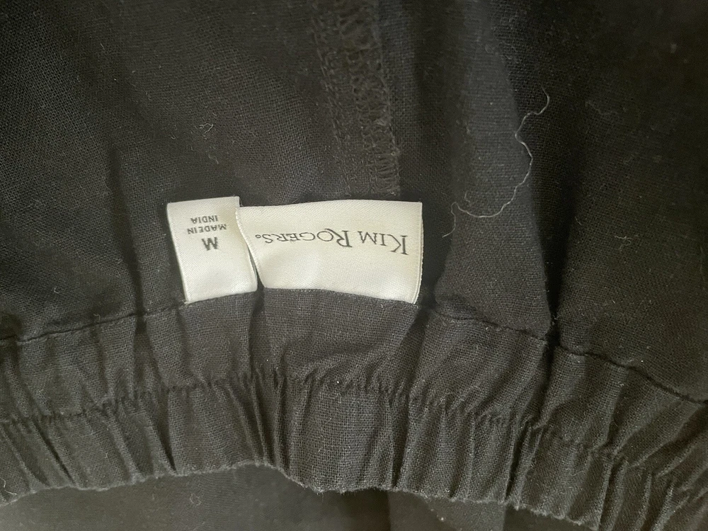Kim Rogers black pants. Size medium. Flat front. Drawstring waist with elastic. Front pockets. Straight leg. Cotton linen blend. Machine wash. Excellent condition. Waist 35 inches Stride 11.5 inches Inseam 30 inches