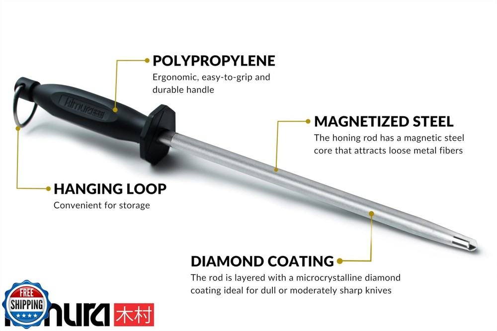 Kimura Professional Diamond Honing Rod, 10 Inch, Silver, Extra Fine Grit, Magnetized, Ergonomic Handle, Versatile Knife Sharpener, Japanese Gift Box Features [ PREMIUM MATERIALS ] - The 10 inch honing rod is made from microcrystalline diamond coated carbon steel that is enhanced and smoothened with Kimura’s proprietary diamond plating process. The honing steel is also magnetized for additional safety. [ ERGONOMIC HANDLE ] - The diamond honing rod's polypropylene handle is non-slip and easy to grip offering superior comfort, with an ergonomic shape that allows for steady and accurate honing. [ HIGHLY VERSATILE ] - The Kimura honing steel is highly versatile allowing you to sharpen kitchen knives of various sizes and shapes. The sharpener also comes equipped with a hanging loop for easy and convenient storage. [ MADE TO LAST ] - The honing rod is made from a single piece of diamond coated carbon steel with a full tang that is bolstered to the handle, which provides exceptional strength and durability - Kimura’s honing rod is sure to stand the test of time. [ HOW TO USE ] - Slide one side of the knife from base to tip at a 15 - 20 degree angle along the rod surface (depending on the angle of the blade). Repeat 1-3 times on both sides of the kitchen knife depending on how dull the chef knife the is. [ GREAT GIFT ] - Our diamond sharpener is packaged in a stylish gift box with a traditional Japanese Kanji design. [ LIFETIME WARRANTY ] - We are so confident in the quality of our honing rod that a lifetime warranty is included in your purchase. If for any reason you are unsatisfied with your purchase, simply contact us and we will make it right. Shipping Free & Fast Shipping: We offer free shipping to most of the USA with a normal delivery time of 3-7 days. However, due to the current situation, additional delivery time (up to 3 weeks) may be required for some items. Alternative Carriers: We may use alternative carriers (e.g., USPS, FedEx, UPS) to ensure your package arrives safely and on time. Due to the use of multiple carriers, we are unable to provide a tracking number automatically. Handling Time: Orders are processed and shipped within 1-2 business days of receiving cleared payment. Shipping Restrictions: Shipping to Alaska, Hawaii, Puerto Rico, Guam, and other US territories may incur shipping charges or delivery restrictions. Please contact us before ordering, or your order can be refunded/cancelled. State Restrictions: Certain items may not be shipped to California due to state regulations. Contact for Tracking Updates: If you require tracking updates or have any concerns about the delivery of your order, please feel free to contact us, and we will be happy to assist you. Return Policy 30-Day Hassle-Free Returns: If you are not completely satisfied with your purchase, you can return the item for free within 30 days of receiving it for a full refund or exchange. Easy Return Process: Contact us, and we will provide you with a prepaid return shipping label and detailed instructions. No Restocking Fee: There are no restocking fees for returns. However, the buyer is responsible for return shipping costs if the return is not due to a seller"s error. Refund Processing: Refunds will be processed within 1 business day of receiving the returned item in its original condition. Feedback Your feedback is extremely important to us. We strive to provide the best products and customer service possible. If you are satisfied with your purchase, please take a moment to leave us a positive review. If you have any concerns or issues with your order, please contact us before leaving negative feedback. We are committed to resolving any problems and ensuring your satisfaction. Contact Us If you have any questions or concerns, please feel free to reach out to our customer support team. You can contact us through the eBay messaging system. We are available Monday to Friday, 9:00 am to 5:00 pm EST, and we will do our best to respond to your inquiry within 24 hours. Thank you for supporting our small family business!