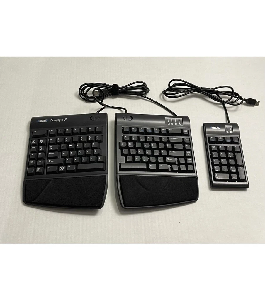 Kinesis Freestyle 2 Ergonomic Split Keyboard KB800, Keyboard Lifts, Wrist Rests & Num Keypad AC800H. Tested and functioning. The keyboard might have scratches, nicks and /or blemishes from normal daily usage but overall is it in good condition cosmetically. Keyboard is used and have been cleaned and tested. Shipping: All Items will be shipped through UPS or FedEx Ground within 1 business day, excluding weekends and holidays. Shipping to lower 48 lower states only. RETURN POLICY: Returns accepted within 30 days of purchase. We ask that if you do decide to return the item, please return it in the same condition as it was received. All returns will be verified through eBay in order to protect the buyer and the seller before getting refunded. Please CONTACT US before requesting a return, so we can proceed with the best possible customer service.