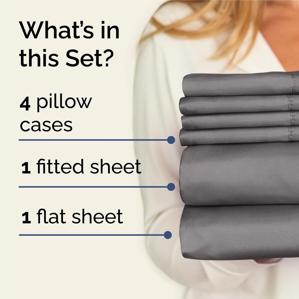 Silky Soft, 6-Piece Premium Sheet Set - Deep Pockets to Easily Fit Any Mattress! Don’t settle for low-quality, poorly stitched King sheet sets that tear easily and feel rough and uncomfortable against the skin. At , we pride ourselves on our 6-Piece Sheet Set’s premium quality, buttery soft, double-brushed fabric - with four cooling, silky pillowcases for deep, luxurious sleep. Cooling and breathable, our machine-washable King size fitted sheet & flat sheet set are made of super-fine fibers that resist pilling, tearing, shrinking and fading. Unlike other sheets King size that are ill-fitting and a struggle to get on the bed, our King fitted sheets has deep pockets to fit mattresses up to 16 inches, for a quicker, easier time making the bed. Fits over mattress toppers and air mattresses, too! ’s 6-Piece Sheet Set features: - 1 Flat Sheet (102” x 105”) - 1 Fitted Sheet (78” x 80”) - 4 Pillowcases (20” x 40”) - Premium 100% Brushed Fabric - Luxurious and Butter Soft - Cooling and Breathable - Deep Pockets to Fit Mattresses up to 16” Deep - Machine Washable -Tear, Shrink and Fade-Resistant! At , we love giving our customers the gift of deep, luxurious sleep - at an affordable price. We have high standards for our bed sheet set King, and work hard to uphold those standards and keep your happy and well-rested. Our hotel quality, ultra soft king sized sheets will leave you sleeping deeply. 6 PIECE BED SHEET SET: 4 pillow cases, 1 flat sheet, and 1 fitted sheet. Flat sheet (102″x 105″) Fitted sheet (78″x 80″) 4 pillow cases (20″x 40″). DEEP POCKETS/ EASY FIT: They fit mattresses up to around 16 inches deep. If your King mattress is smaller than 16 inches it will fit just fine. A lot of mattresses are pretty big these days. We feel this is a good universal size that fits most mattresses; Complete set with everything you'll need - top flat sheet, bottom fitted sheet and extra pillowcases! FEEL THE DIFFERENCE: If you're looking for very soft sheets you have found them! They're breathable, cool and super silky soft. The comfort of these sheets will have you coming back! They're softer than Egyptian cotton and organic cotton sheets! Best for any room in your house - bedroom, guest room, kids room, RV, vacation home. Great gift idea for men and women, children and teens. HIGH-QUALITY BRUSHED MICROFIBER: A lighter difference; a softer, finer touch. These King size sheets are made of the high-quality double brushed microfiber yarns. The virtually weightless wonder of sheets will have you coming back for more. Linger in your dreams. GREAT SHEETS FOR THE PRICE! These are the softest and most affordable sheets you’ll find; a great bang for your buck for comfort and softness. Unlike many other expensive sheets, our CGK Bed Sheets will give you comfort and softness at a reasonable price. Each sheet set comes complete with luxuriously soft flat sheets, fitted sheets and extra pillowcases.