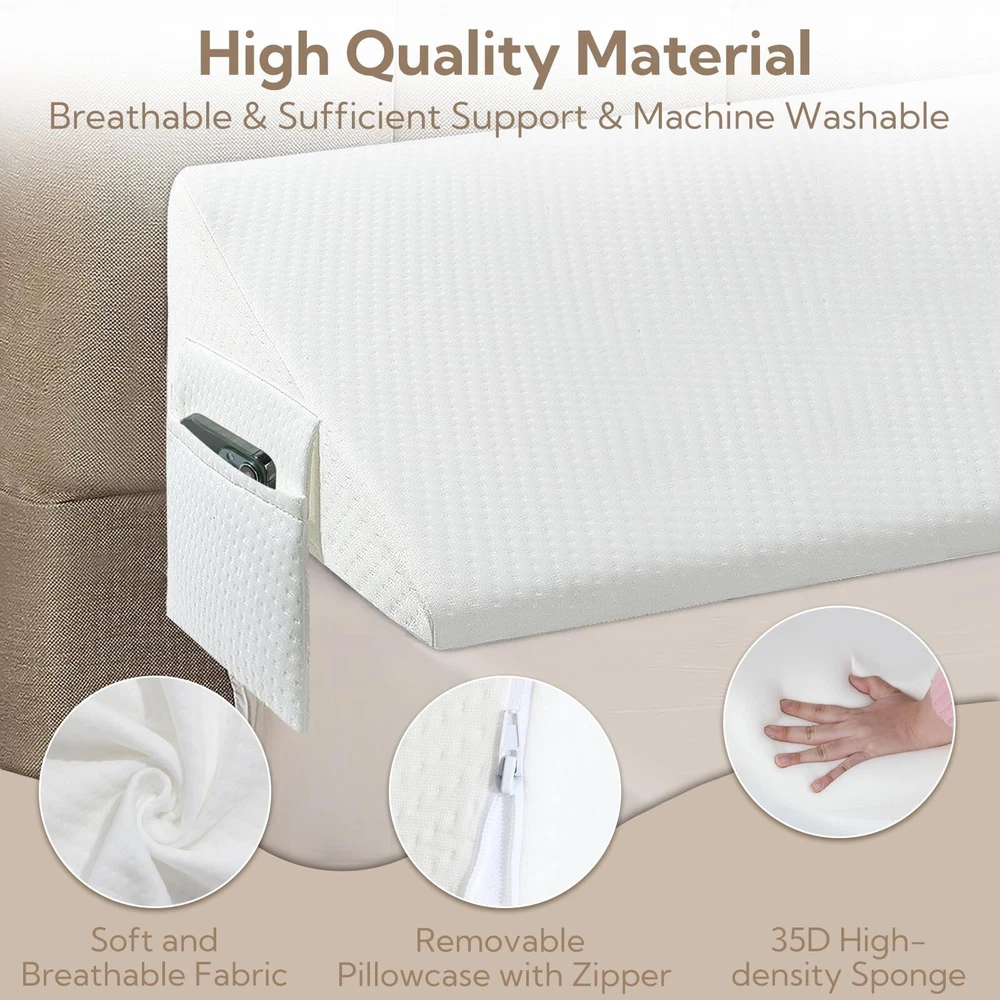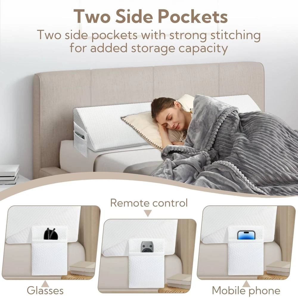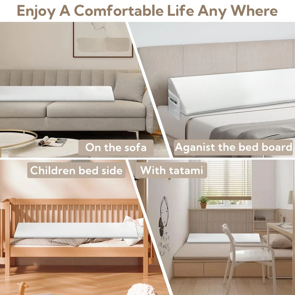 King Bed Wedge Pillow - Versatile Wedge Pillow Bed Gap Filler. Can Also be Used as a headboard Pillow, Mattress Wedge, and Bed Gap Filler (White 76"x10"x6") Product Details Color: White Size: King Brand: AAAini MPN: Does not apply UPC: Does not apply EAN: Does not apply Brand: AAAini Special Feature: Bagged Color: White Size: King Fill Material: Memory Foam Brand: AAAini Special Feature: Bagged Color: White Size: King Fill Material: Memory Foam Shape: Wedge Age Range (Description): Adult Recommended Uses For Product: NO Use for: Whole Body Material: Air-layer Fabric Material Product Care Instructions: Machine Wash Number of Pieces: 1 Pattern: Solid Manufacturer: AAAini Product Dimensions: 76"L x 10"W Unit Count: 1.0 Count Item Weight: 4.4 pounds Country of Origin: China Date First Available: January 11, 2024 Versatile Gap-Filling Design: Our pillow not only closes the gap between the headboard and mattress, preventing items and pillows from falling off the bed, but it is also tailored for gaps from 0 to 5.5 inches. Offering a secure solution, it eliminates worries about losing items. Experience stable support with our high-density foamyour pillow stays in place while you sleep. Choose from various lengths to find the perfect fit for the width of your bed. The triangular design not only fills gaps at various angles but also supports your head and neck for a more comfortable sleep, reducing the need for multiple pillows in your bed. Large Capacity Pocket Storage Design: Beyond its gap-filling function, our pillow boasts two spacious pockets on both sides. Easily store items like phones, remote controls, glasses, and more, keeping your resting space tidy and organized. Removable and Machine-Washable Cover: Our pillow features a removable, machine-washable cover for easy cleaning and hygiene maintenance. Regular washing helps remove stains and odors, ensuring the pillow stays fresh and sanitary.