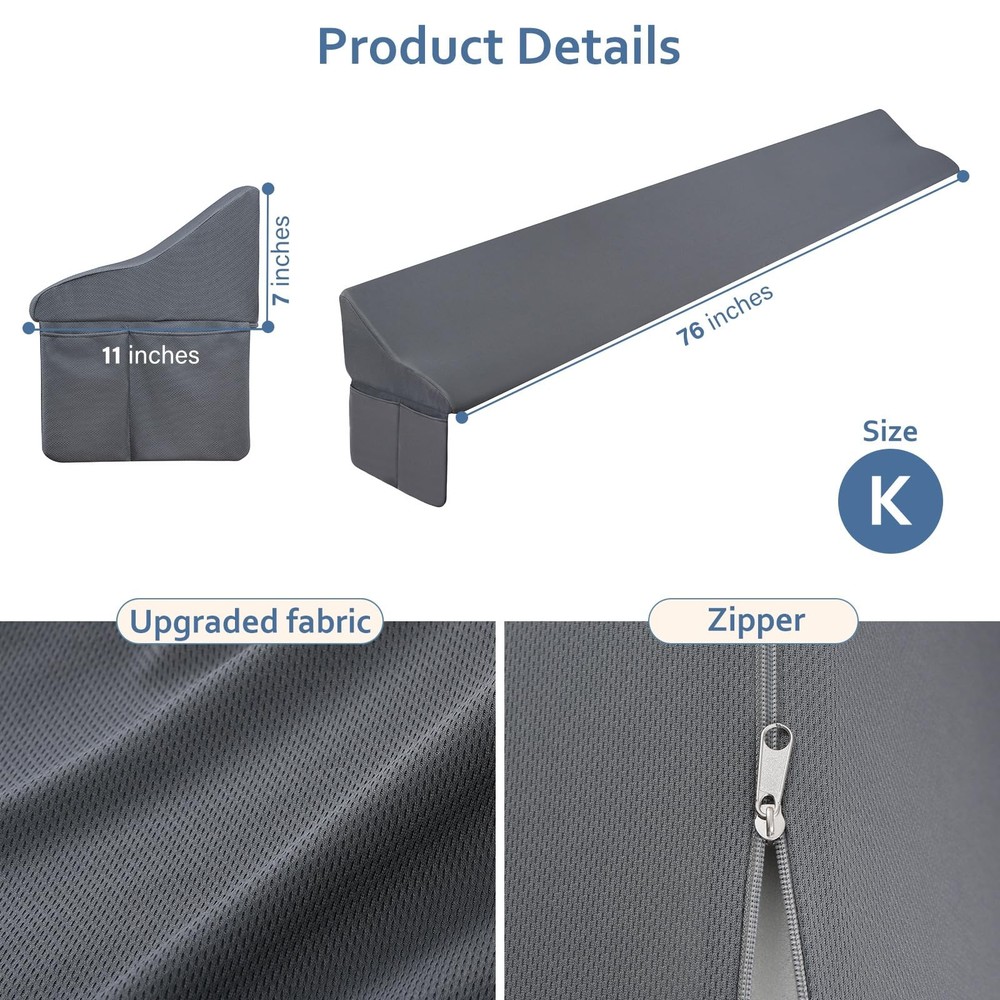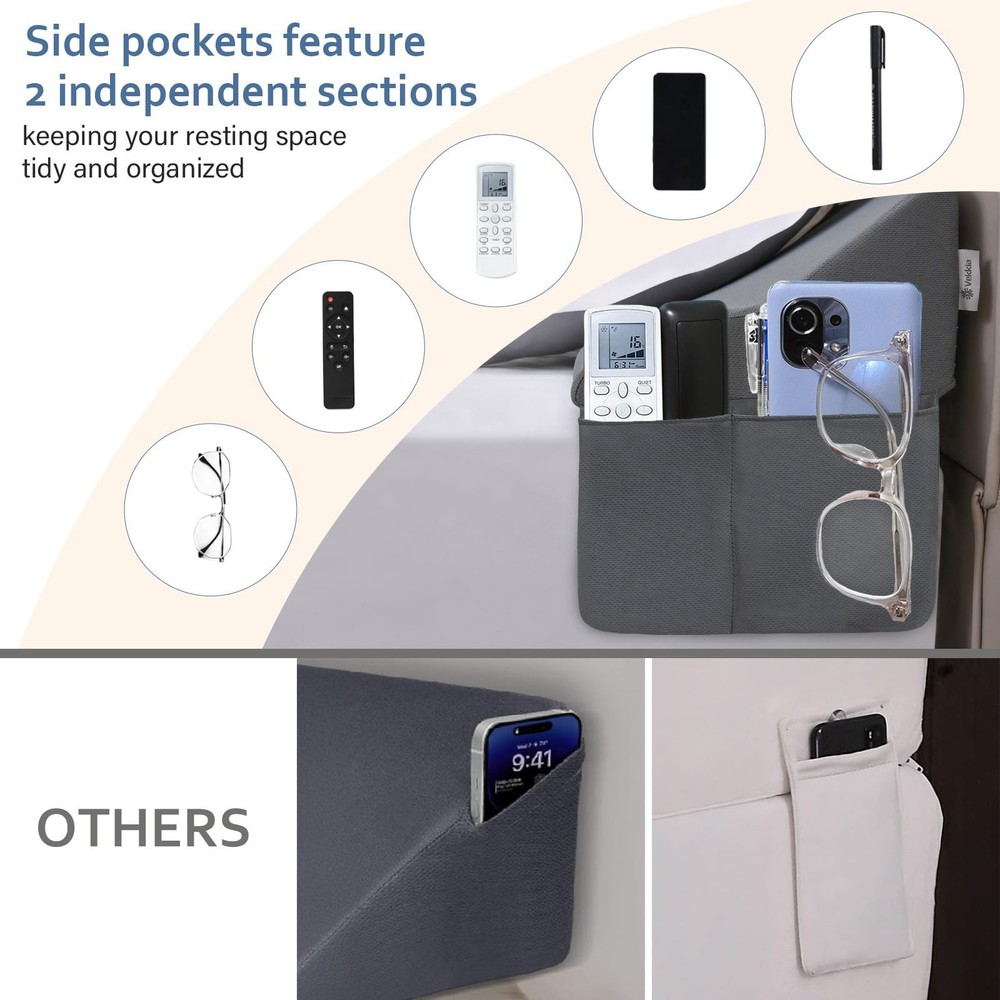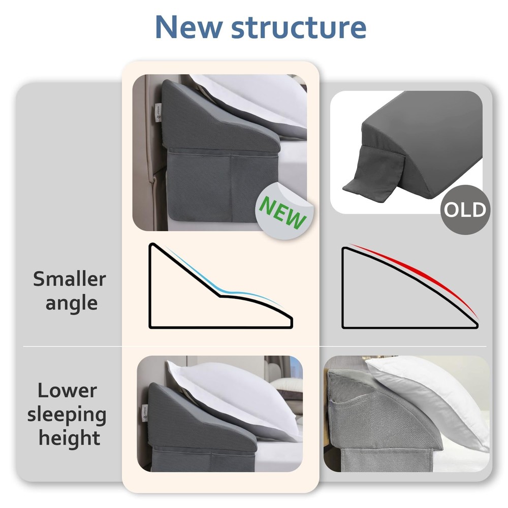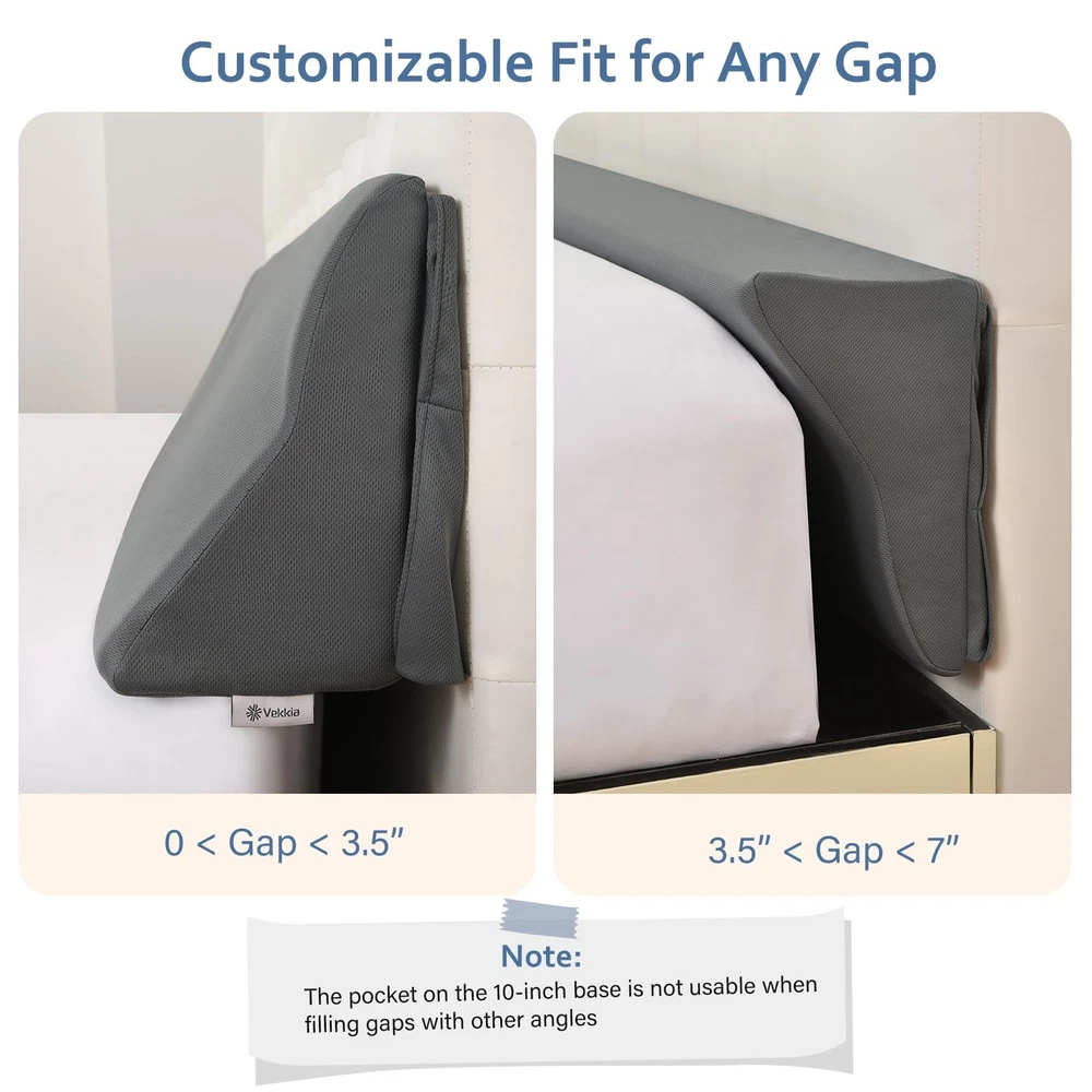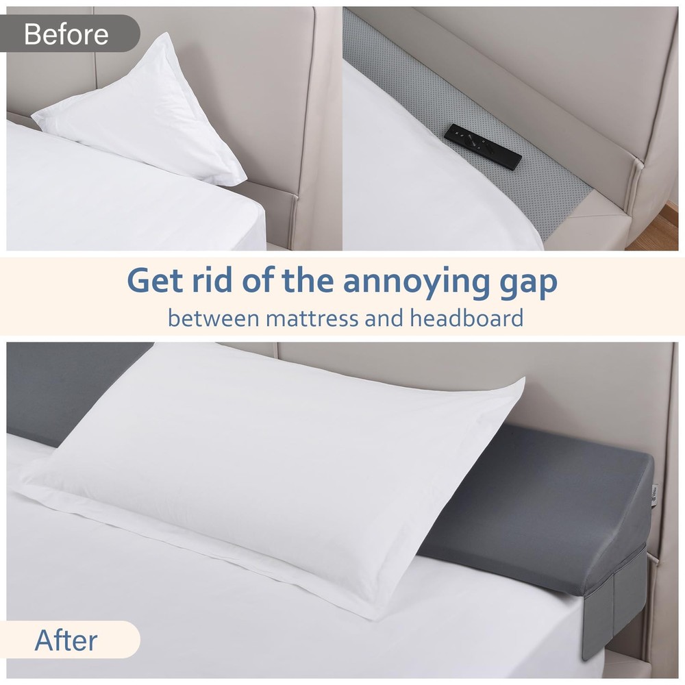 Specifically designed to fill gaps under 6 inches between the mattress and headboard, this upgraded bed wedge pillow effectively prevents items like pillows, phones, and remotes from falling into hard-to-reach spaces. The triangle wedge features a flatter angle for enhanced comfort, providing better support while keeping your head at a lower elevation. The large, divided side pockets on both sides offer organized storage for essentials such as phones, glasses, and remotes. Filled with high-density foam, the pillow maintains its shape and offers lasting support. The breathable, soft cover is wrinkle-resistant, removable, and machine-washable for easy cleaning and maintenance Gap-Filling Protective Design: Specifically designed to fill the gap under 7 inches between the headboard and mattress, effectively preventing pillows, phones, remotes, and other items from falling. It keeps the bed tidy and reduces the hassle of lost items, providing a more secure sleep experience. Upgraded Structure and Comfort: After multiple improvements, the new design features a flatter angle and a lower head elevation for better ergonomic support, ensuring maximum comfort and optimal performance when used for gap filling. Large Capacity Divided Side Pockets: The upgraded side pockets are larger and include multiple compartments for organized storage of daily items such as phones, glasses, and remotes, making it easier to keep bedside essentials neat and accessible. High density foam providing firm support - We use high density foam which provides firm support.headboard pillow can fix the mattress gap with little movement. The bed gap filler can easily expand to its original size after unpacking and keep its shape after a long time using. Breathable and Soft Fabric: The cover is made of upgraded fabric that is more breathable, softer, and wrinkle-resistant, ensuring comfort in use. It is also easy to remove and clean, keeping the pillow hygienic and extending its lifespan. Compression Shipping Notice: This product is shipped in a compressed package. Upon opening, it will regain its shape within 12 hours and achieve its intended firmness within 24 hours. This is a normal physical property of foam, so please allow the pillow time to fully expand for the best experience.