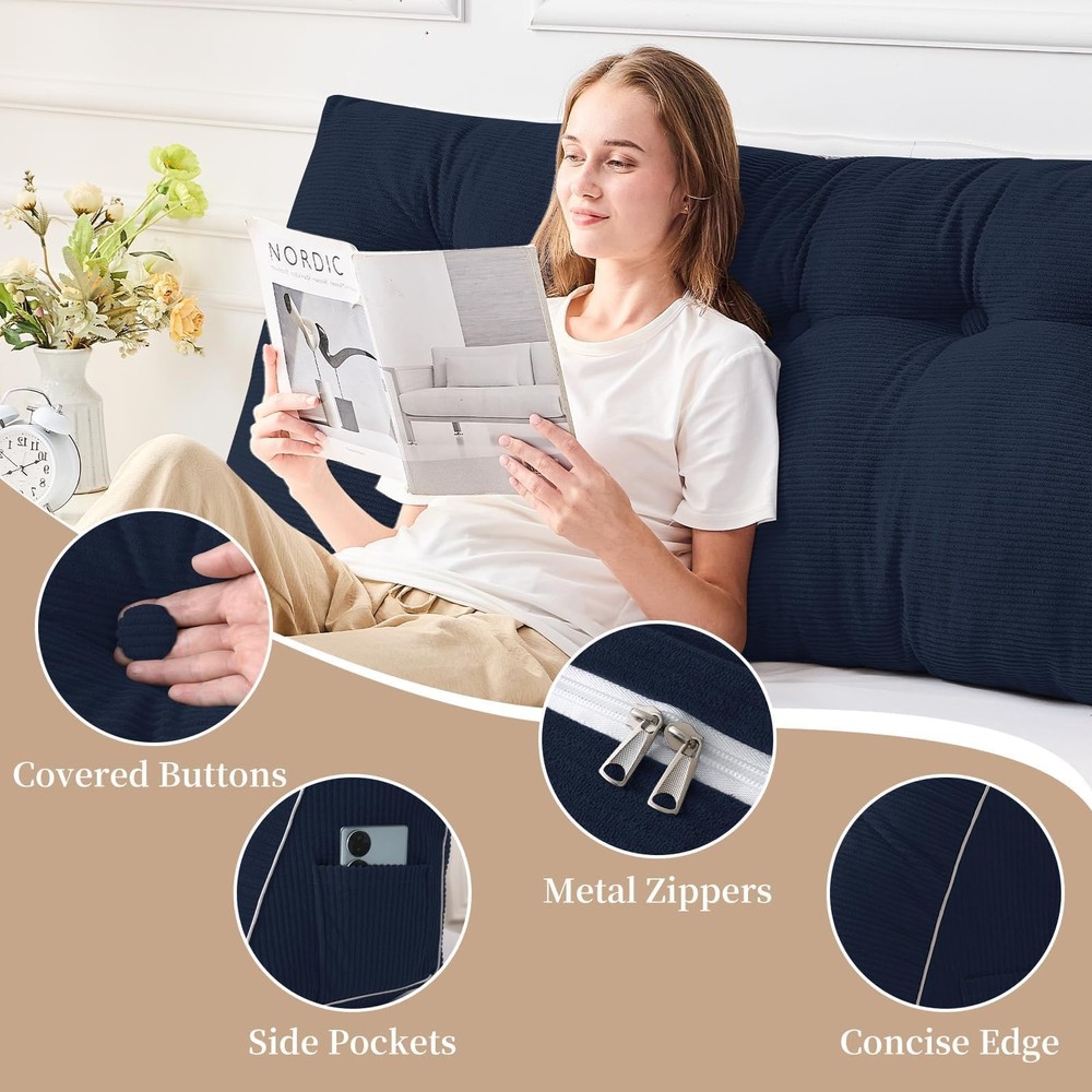 Made with soft fabric and high-density filling, this headboard pillow contours your body's curves, offering exceptional comfort while relieving strain on your back and shoulders. Whether used as a reading pillow, backrest, or leg support, the pillow headboard provides ultimate versatility for relaxation. The cover features a metal zipper for easy removal and cleaning, while side pockets designed to store small essentials like your phone, remote, or glasses. With its sleek, modern design, this daybed pillow enhances the style of any room. Vacuum-packed for shipping, simply allow up to 48 hours for the pillow to expand and regain its optimal shape for maximum comfort. Ultimate Comfort: Filled with 40% 7D silicified fiber and 60% 3D polyester fiber, the headboard pillow king provides an optimal balance of support and comfort, ensuring a restful experience, great for reading, working, or resting Versatile Use: The pillow headboard is designed to meet your needs in any position. It can be placed on your bed as a reading pillow or bed wedge, used on the couch as a back pillow, or propped under your legs for support, offering ultimate flexibility Convenient Design: The wedge headboard pillow's cover made of soft velvet comes with a metal zipper for easy removal and cleaning. The side pockets offer handy storage for small essentials like phone, remote, or glasses, keeping them close at hand Stylish Design: The daybed pillow features concise edges that enhance its 3D look and add a modern touch to any space. Whether placed on your bed, sofa, or daybed, this headboard pillow elevates the aesthetic of your living room, bedroom, or dorm About : is dedicated to bringing comfort home. Our wedge pillow headboard combines thoughtful design, premium materials, and health benefits to create the perfect blend of support and relaxation, turning your space into a cozy retreat