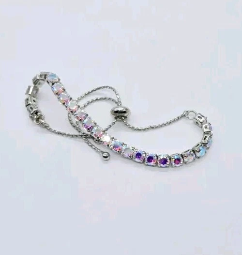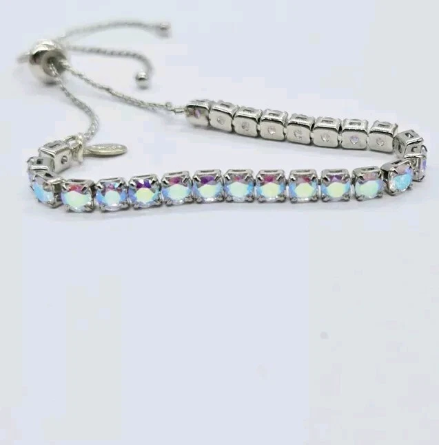 Made up of faceted aurora borealis stones that reflect flashes of rainbow colors, this bold and beautiful Bracelet can be worn casually by day or in a formal setting at night. From Kirks Folly. Plated Silver tone Aurora borealis faceted, polished finish Pull Closure or Expansion Measures approximately - One size should fit most Imported
