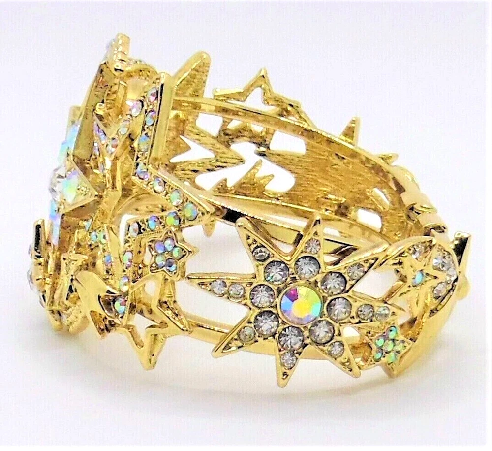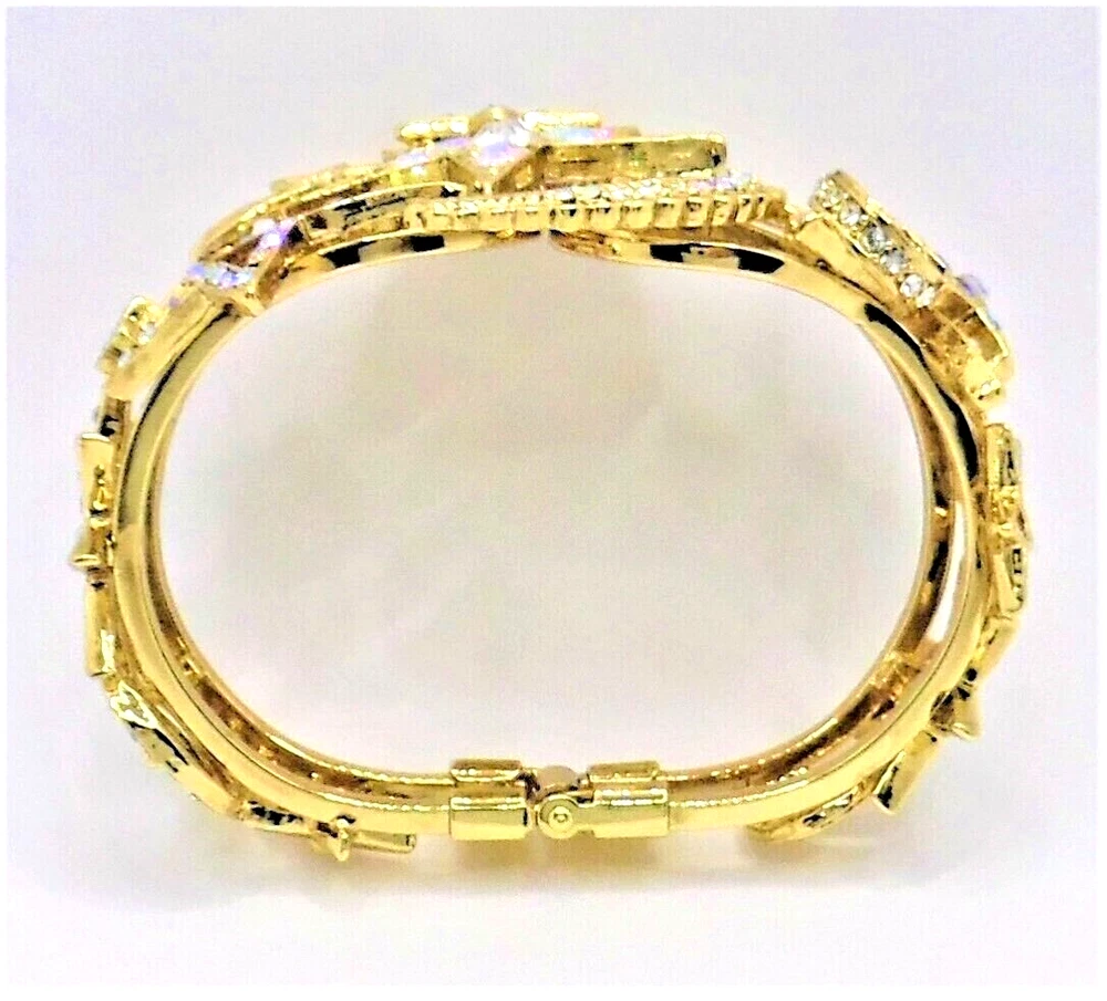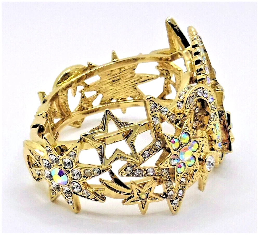 Kirks Folly MOON MAGIC Hinged Bangle Bracelet. Approximate measurements: Inside diameter- 1-3/4" height x 2-1/2" wide. Top face width 1-3/4". Aurora borealis crystals, plated gold-tone finish. Clamper closure. Comes in Kirks Folly Box.