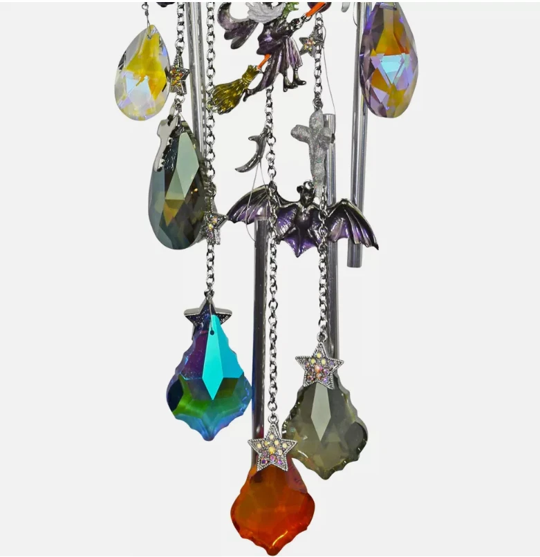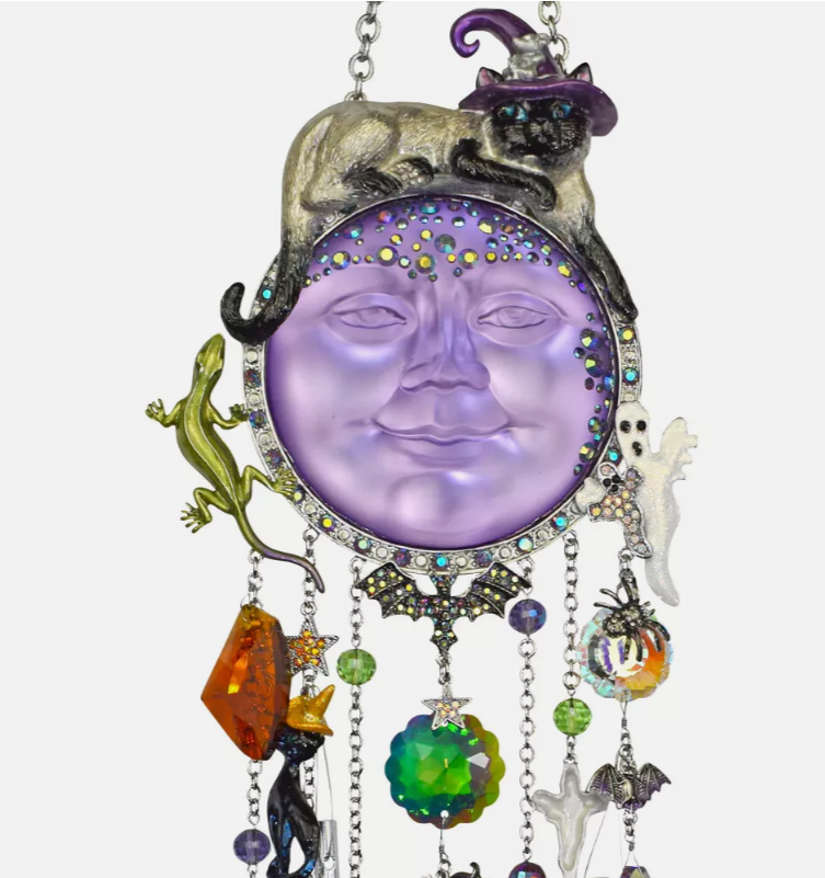 Salem the witch cat is lounging comfortably over a sparkling serene and peaceful Halloween moon on the Salem Cat Wind Chime. Wearing a lovely lavender witch hat she gazes down over a world of flying creatures, witches, bats and ghosts. To light their way multi colored large faceted crystals shine and twinkle in the light of the harvest moon. The gentle sound of the chimes beckons all things that go bump in the night! Plated Silver tone Measures approximately 5 1/4" x 20" long.