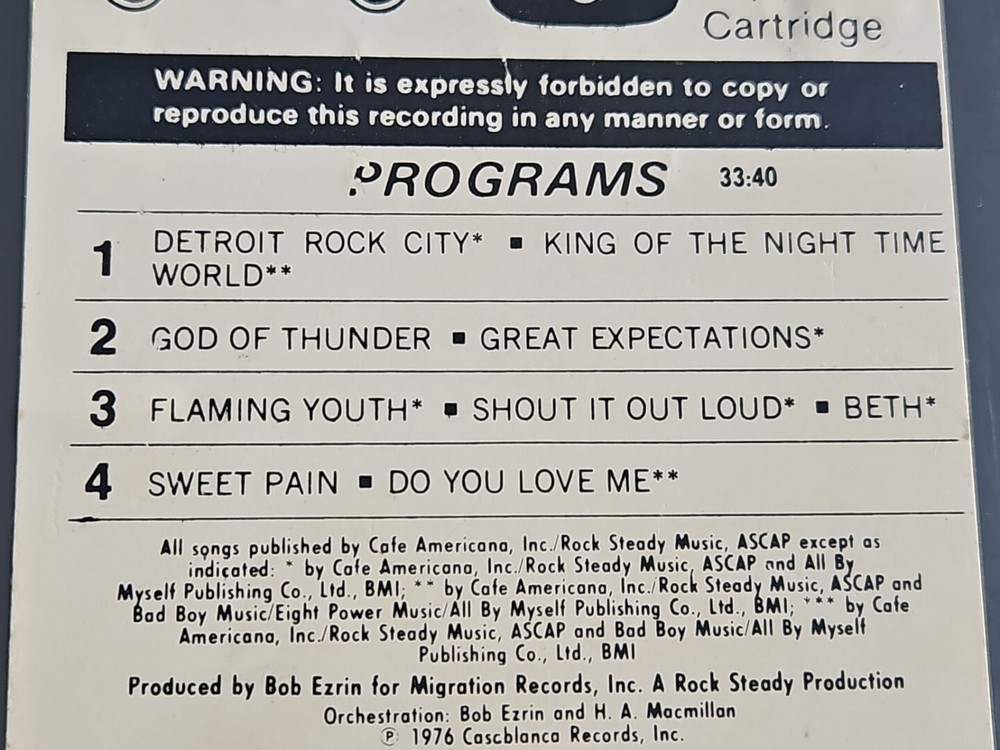 Kiss Destroyer 8-Track Cartridg Tape CAF8 7025 1976 Casablanca Rec. Untested EX Observe photos well for details. Very Good~~~~ An item that is used but still in very good condition. No damage to the jewel case or item cover, no scuffs, scratches, cracks, or holes. The cover art and liner notes are included. Items are carefully inspected to the best of my ability. I store my items in a pet and smoke free home. I ship quickly and welcome all questions and offers. If you would like to order more than one item, send me an offer so I can do combined shipping & save.