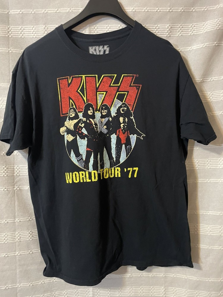 Show off your love for the iconic rock band Kiss with this black T-shirt featuring a graphic print of the Word Tour 77 logo. With short sleeves and a crew neckline, this regular fit T-shirt is made of comfortable cotton material. Perfect for any fan of the band, this T-shirt is a must-have for any music lover's wardrobe. The size is XL and it is suitable for men. The T-shirt is designed with the theme of rock and music in mind, and is perfect for anyone who wants to show off their love for the band. Made in Honduras, this T-shirt is a great addition to any fan's collection. Great condition- Smoke free home- Thanks for stopping in check out my online thrift stuff added daily much love Shelly J 💚