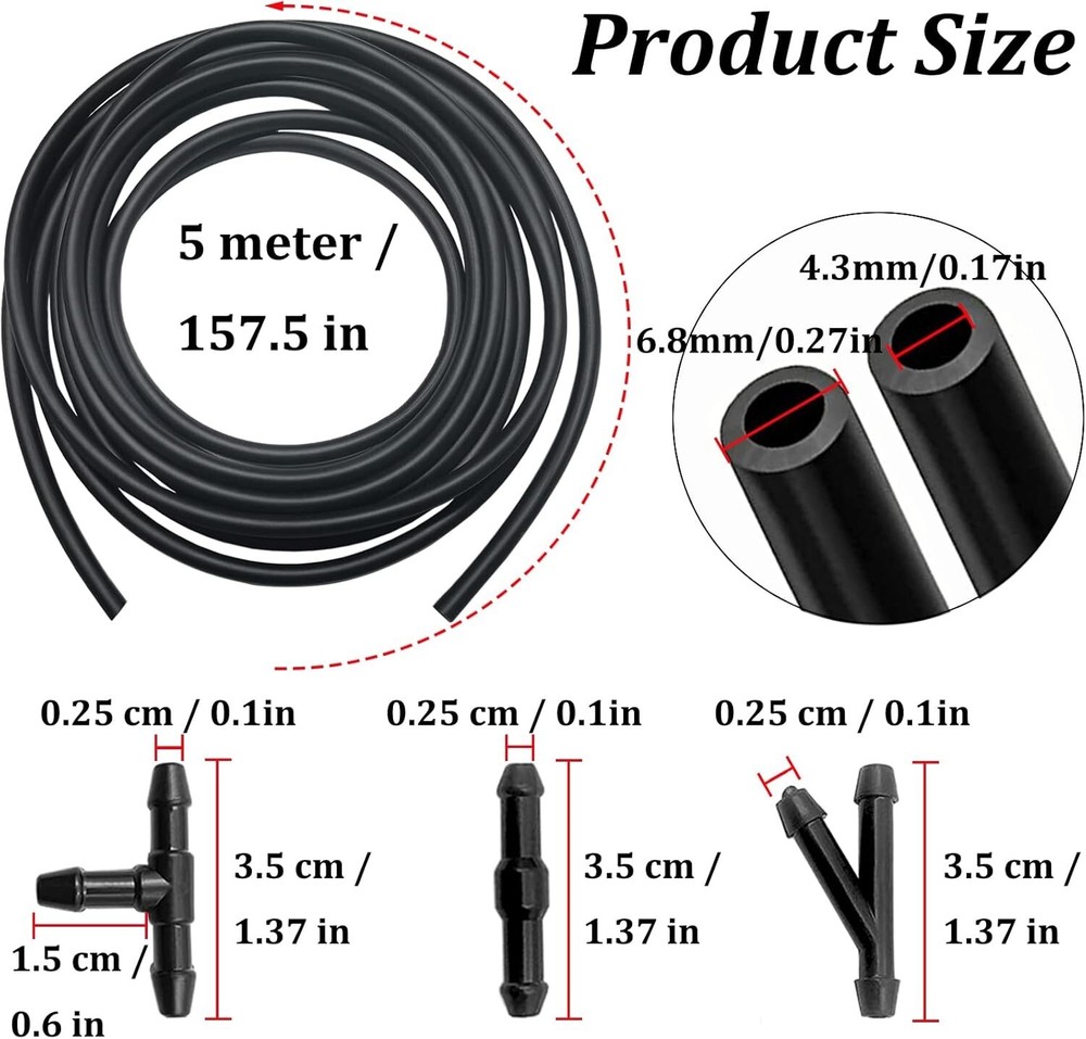 Kit de reparación de mangueras lavaparabrisas: Este kit es fácil de reemplazar e instalar. Le ayuda a reemplazar mangueras viejas de forma fácil y rápida, conectando correctamente la bomba de agua de su auto a la boquilla del parabrisas para garantizar una pulverización de agua y una limpieza de vidrios suaves. Puede reemplazar el nuevo kit de reparación de mangueras limpiaparabrisas usted mismo y ahorrar dinero en su querido auto. Kit de mangueras lavaparabrisas premium: Nuestro kit de boquillas lavaparabrisas está hecho de caucho de alta calidad, suave y elástico, resistente y robusto para un uso prolongado. Si siente que su vieja manguera o boquilla lavaparabrisas no funciona para limpiar los vidrios de su auto, puede usar nuestro kit de mangueras limpiaparabrisas premium para reemplazar su vieja manguera de líquido lavaparabrisas fácilmente. Compatibilidad: Este kit de reparación de mangueras limpiaparabrisas es compatible con la mayoría de las mangueras y boquillas lavaparabrisas, ya que el conector de la manguera lavaparabrisas es una pieza universal para la limpieza de vidrios de autos. El kit de manguera y boquillas para lavaparabrisas se usa ampliamente en autos, SUV, camionetas, etc. Además, es fácil conectar las bombas de agua y las boquillas del auto. De esta manera, este kit de conector de manguera de lavaparabrisas le brindará una vista clara de su auto. Manguera universal para líquido lavaparabrisas: al igual que el kit de reparación de parabrisas, la manguera del lavaparabrisas tiene cuatro metros de largo y puede cortarla para adaptarla a sus necesidades. Además, este kit de reparación de manguera de limpiaparabrisas incluye tres formas de conectores (tipo T, tipo Y, tipo I) para satisfacer las necesidades de diferentes autos. No gaste mucho dinero en el reemplazo del kit de boquillas del lavaparabrisas. Kit de reparación de parabrisas: incluye 1 manguera de lavaparabrisas de 4 m + 12 conectores de manguera de limpiaparabrisas (incluidos tres tipos: 4 tipo T, 4 tipo Y, 4 tipo I). Dimensiones: La manguera del lavaparabrisas tiene una longitud de 4 metros (157,5 pulgadas), un diámetro interior de 4,3 mm (0,17 pulgadas) y un diámetro exterior de 6,8 mm (0,27 pulgadas). Si tiene alguna pregunta sobre el producto, no dude en contactarnos y haremos todo lo posible por resolverla. Este es un kit de conexión para manguera de lavaparabrisas.