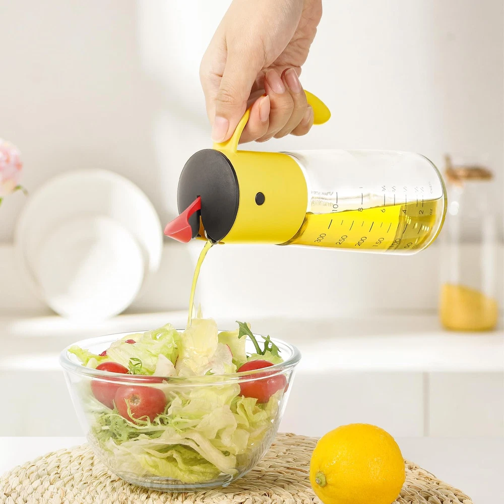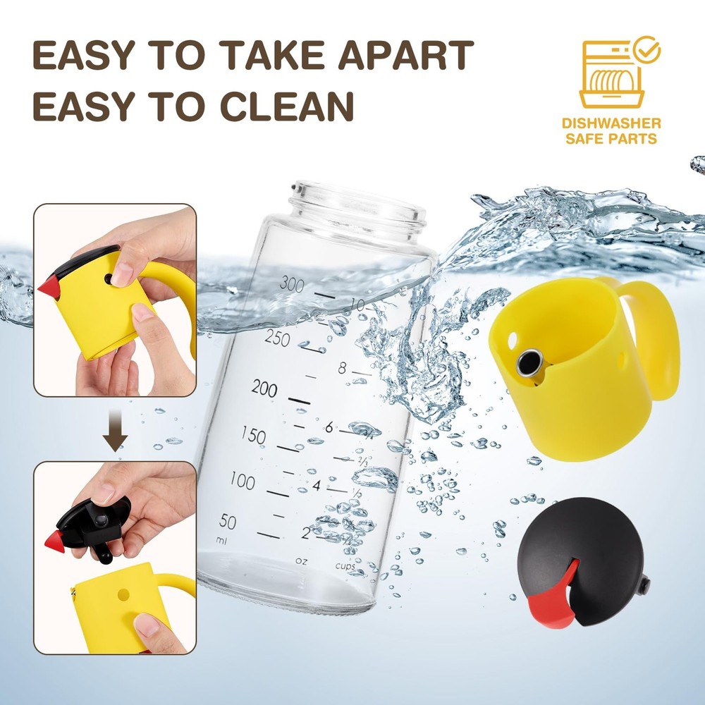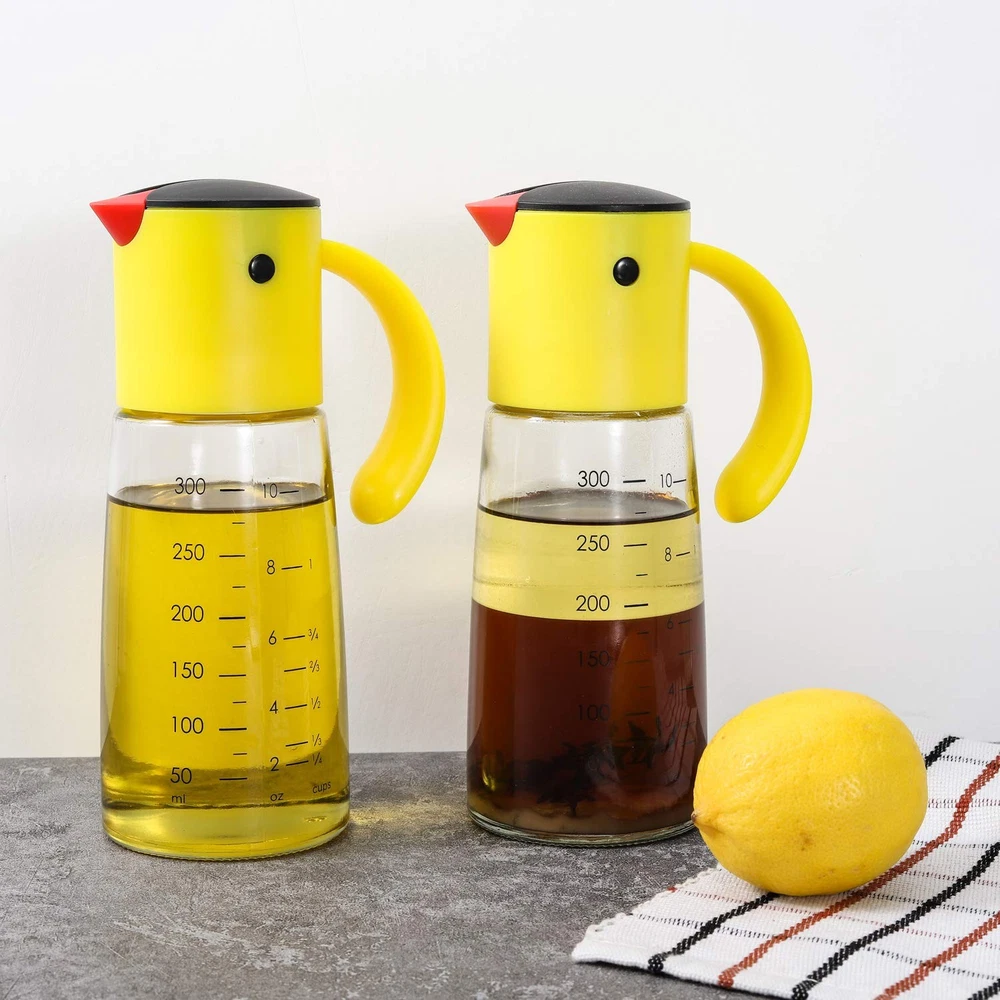 SPECIFICATION capacity:300ml Oil Bottle(11 OZ) size:2.75 inch wide 7.4 inch tall Frees your hands with ONE-HAND control Automatic Oil Dispenser HOW TO USE: Turn the cap, counter-clockwise to open, fill with your choice of oil vinegar or non-viscous kitchen liquids,pour downward, the lid will be opened automatically, one-handed operated. It opens on it's own when tilted,It closed when it's uprgiht. Do Not place the top mechanism in Dishwasher,ONLY GLASS BOTTLE IS DISHWASHER SAFE. the black lid can be detached, press down the location of 2 black eyes, pull out the black lid,then you can clean it.. 2 Pieces a Set OIL NOT INCLUDED Automatic Flip lid Design - The flip lid of oil & vinegar dispenser bottle will open automatically when the bottle is tilted, and close when upright, allows for easy, one-handed pouring. You don't have to press by the thumb and enjoy a perfect pour every time. [Capacity] 10 oz (300ml), set of 2. No-Drip Spout & Leakproof Oil Bottle - Unique spout avoid dripping when the kitchen dispenser bottle is turned back and you can better control the amount of oil and no worry about over dressing. With leakproof silicone sealed gasket inside the cap to avoid leakage and spillage, ensure the freshness of liquid stored. Easy to Clean and Detach - The bird lid of the olive oil dispenser can be detached by pressing the bird's eys. The whole oil and vinegar dispenser set is easy to clean and dishwasher safe. Suitable For Various Seasonings - Ideal for dispensing liquid condiments such as olive oil, vinegar, soy sauce, syrup, cooking wine and more. 【 Reddot award winner】cute bird look design is perfect for any type of home decor. It can also be an impressive gift for many occasions. Risk-Free Purchase - We do value our customers and hope you will enjoy a pleasant shopping experience. If there is any problem with our products, please contact us without hesitation and we will solve your problem as soon as possible.