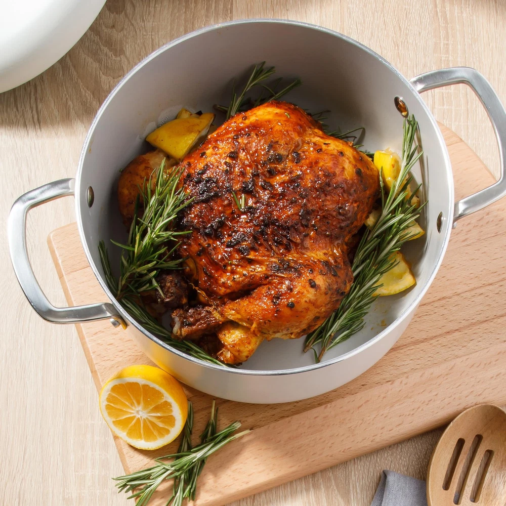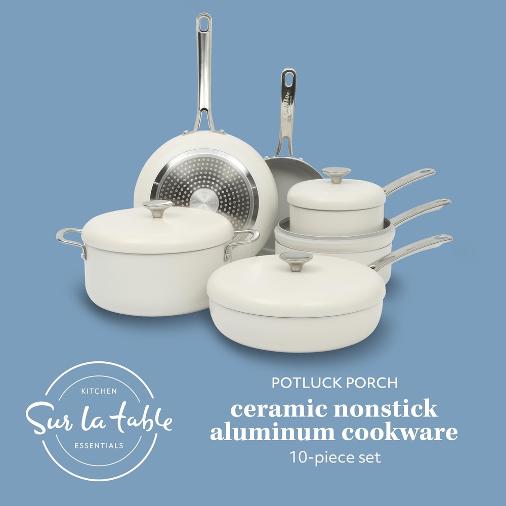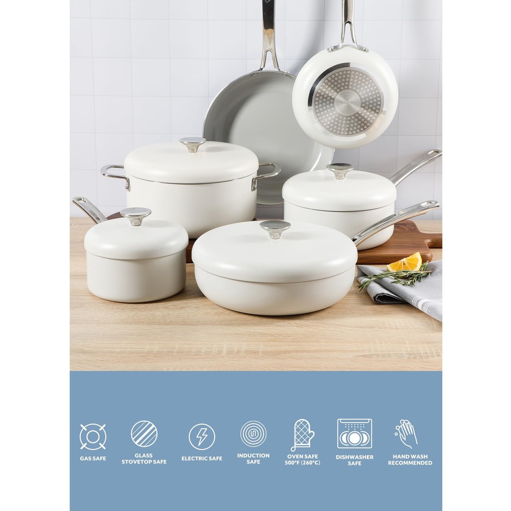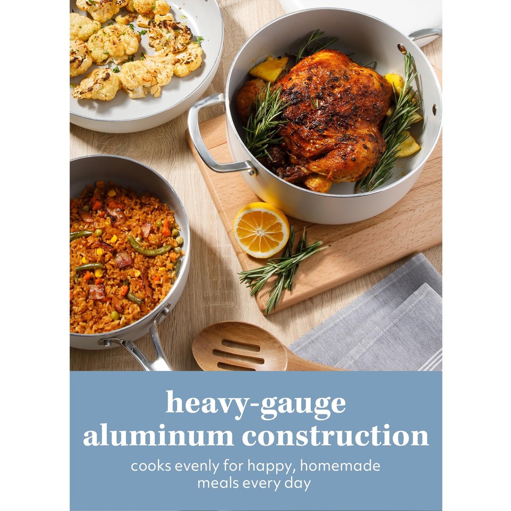 WHAT'S IN THE BOX: two frying pans (8 inches and 10 inches), two saucepans with lids (1.5 quarts and 2 quarts), one 3-quart sauté pan with lid and one 5-quart Dutch oven with lid HAPPINESS IS HOMEMADE: Kitchen Essentials is all about making and sharing good food at home together. from preparing the freshest ingredients to the beautiful mess of cooking a family recipe, we encourage you to roll up your sleeves, mix up a happy kitchen, and set the table for free-flowing conversations over an easy, generous, and crowd-pleasing meal. CERAMIC NONSTICK COOKWARE: easy-release interior makes more room for healthier cooking options and less time for cleanup. HEAVY-GAUGE ALUMINUM COOKWARE: durable aluminum pots and pans cook evenly to serve happy and homemade meals every day. they feature a rounder and wider shape, similar to a traditional caldero, to faciliate smooth and easy stirring. INDUCTION-FRIENDLY: works on induction, gas, electric, halogen, ceramic and glass stoves