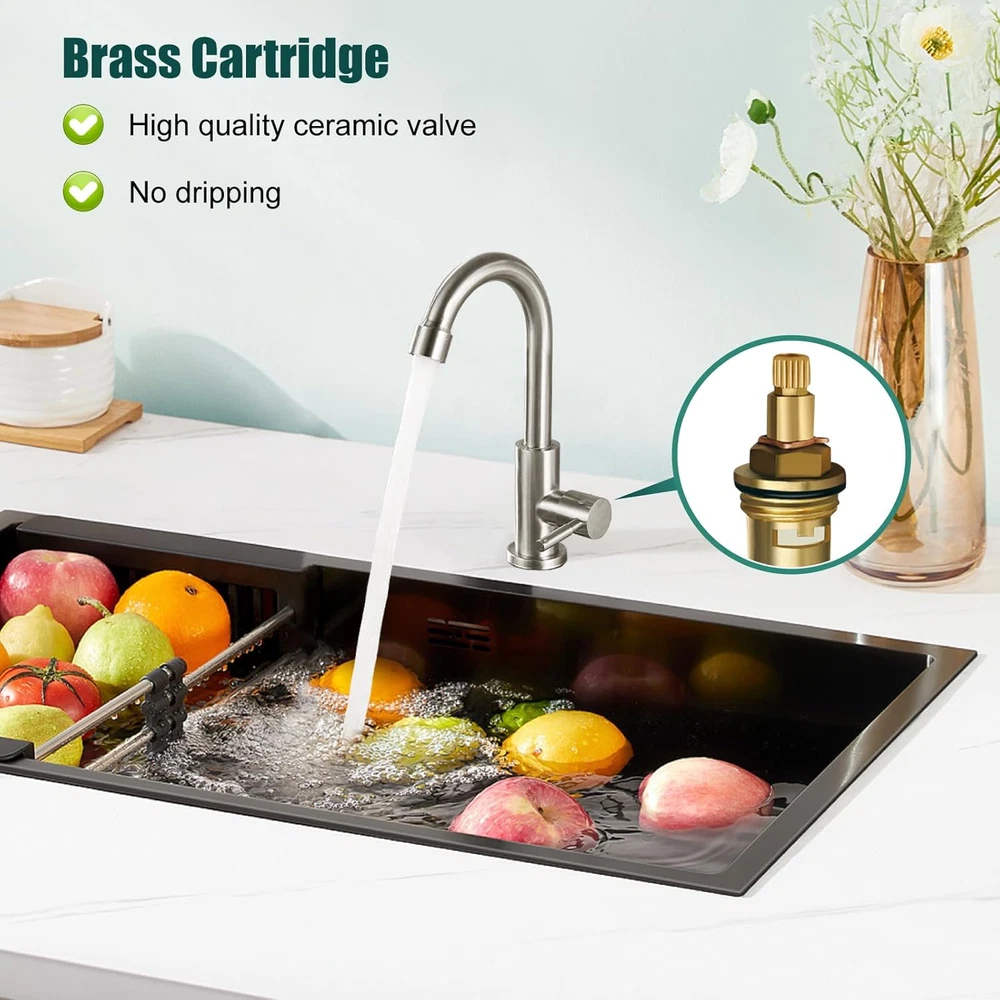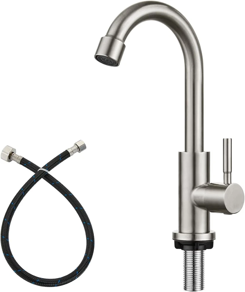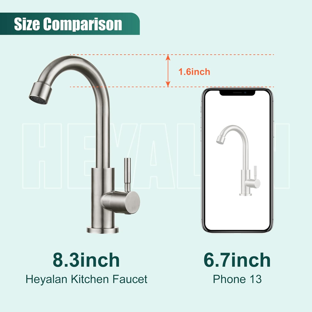 Store New Arrivals Add to Favorite View Feedback Kitchen Faucet Single Handle 1 Hole Deck Mount SUS304 Stainless Steel Sink Bar Tap Goose Neck,Cold Water Faucet,Brushed Nickel Description Item model number B08LGQGGWK Style Cold Water Faucet Spout Height 6.1 Inches Hole Count 1 Units Spout Reach 4.3 Inches Country of Origin China Warranty Type lifetime Speaker Cutout Diameter or Length 1.5 Inches Maximum Flow Rate 1.79 Gallons Per Minute Batteries Included? No Usage indoor use Number of Pieces 1 Batteries Required? No Finish Brushed Brand Heyalan Material Stainless Steel Installation Type Single Hole Model Name B08LGQGGWK Finish Type Brushed Package Dimensions 14.09 x 7.17 x 1.5 inches Hose Length 60 Centimeters Included Components Aerator, Deck Plate, Handle, Installation Hardware, Instruction Manual Item Package Quantity 1 Spout Design Goose Neck Number of Handles 1 Item Weight 1.15 pounds Is Electric No Special Features Water Saving System, 360 Swivel, cold water faucet Special Feature Water Saving System, 360 Swivel, cold water faucet Valve Type Cartridge Valve Mounting Type Deck Mount Series ID cold water faucet Color Brushed Nickel Handle Material Stainless Steel Recommended Uses For Product Kitchen Manufacturer Heyalan Handle Type 1 handle Size 8.3inch SUS304 Stainless Steel Construction : Maximum Flow Rate:1.79 Gpm 6.78L/Min. Single lever goose neck bathroom faucet with commercial SUS 304 Stainless Steel ,superior corrosion &rust -resistant finish . Feature : Cold water faucet only upgraded threaded pipe extended to 2.4 inch provides you with a convenient installation for all length of connectors . All Connectors are US Standard 3/8" Thread. Design : The faucet cold water only high-arc spout reach 4.3” and 360 degree rotation spout offer superior clearance for a variety of sink activities . Longer extension tube reduces water leakage. Installation : Single hole deck mounted sink faucet ,easy installation , 60cm water hose .Diameter of hole in sink should be 22mm to 38mm ( 0.86 inch to 1.5 inch ) . Including : The packaging includes faucet body,24 inch water pipe, and some fixed hardware . Product Description This faucet is made of premium SUS304 stainless steel, more anti-oxidation and anti-scratch. High spout can be 360 degree rotated. Longer extension tube reduces water leakage. The total height of the faucet is 8.3 inches ( 21 cm ). 1 Quality Promise 2 Special Function 3 Size Display Product Details Display Longer threaded pipe The longer threaded pipe, has higher connection strength, better sealing performance and more stable installation. Matched Hose 3/8" Standard pipe connection and G1/2 female thread pipe adapter are resistant to corrosion, ensuring quality and longevity. Brass valve core The faucet valve core is made of solid brass, sturdy and durable, to ensure durability and high quality. Ultra long thread rod Pre-upgrade 2.48" ultra long thread rod suit for thick countertops. Different Sizes of Cold Water Only Faucet Add to Cart Add to Cart Add to Cart Add to Cart Add to Cart Add to Cart Add to Cart Customer Reviews 4.5 out of 5 stars 981 4.4 out of 5 stars 78 4.4 out of 5 stars 242 4.5 out of 5 stars 981 4.2 out of 5 stars 85 4.5 out of 5 stars 981 4.5 out of 5 stars 981 Price $19.52 $ 19 . 52 $23.83 $ 23 . 83 $24.97 $ 24 . 97 $24.99 $ 24 . 99 $24.99 $ 24 . 99 $23.89 $ 23 . 89 $21.97 $ 21 . 97 Faucet Height 28cm/11inch 21cm/8inch 21cm/8inch 28cm/11inch 30cm/12inch 27cm/10.64inch 27cm/10.64inch Finish Brushed Nickel Matte black Brushed Nickel Matte black Brushed Nickel Matte black Brushed Nickel Material 304 Stainless steel 304 Stainless steel 304 Stainless steel 304 Stainless steel 304 Stainless steel 304 Stainless steel 304 Stainless steel Hot and Cold Cold Only Cold Only Cold Only Cold Only Cold Only Cold Only Cold Only Style Arc Gooseneck Arc Gooseneck Arc Gooseneck Arc Gooseneck Arc Gooseneck Seven-character Seven-character Drain includes ✘ ✘ ✘ ✘ ✘ ✘ ✘ Single handle ✔ ✔ ✔ ✔ ✔ ✔ ✔ ABOUT US We offer the best prices around on high quality products. Our E-store includes media such as books, movies, music and games while offering electronics, toys, sporting apparel, clothing, tools, general home, garden items and more. SHIPPING We are always working hard to ensure your package arrives as soon as possible. Please understand that some factors like weather, high postal traffic, and the performance of shipping companies are outside of our control. We offer free shipping to the lower 48 states and ship within 2 business days of payment, usually sooner. We do not accept P.O. Boxes. Please provide a physical address. RETURNS We offer a 30-Day Return Policy on items which you are not completely satisfied with. You have the option for a full-refund or an exchange of the item. No returns are available on items shipped outside of the USA. PAYMENT We accept PayPal. CONTACT US This page content is yet to come Please ad us to your favorite seller and visit again later Thank You