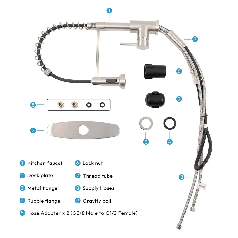 Kitchen Faucet With Pull Down Sprayer Material: 304 Food Grade Stainless Steel Finish: Brushed Nickel Cartridge: Lead-free Solid Brass Cartridge Nozzles: ABS Plastic Materialof Pull down faucet hose: Food-grade PEX Hose and Nylon Braided Outer shell Length of Pull down faucet hose: 19.7 inches Spout Swivel: 360 Degree Sprayer Function: Spray&Stream High-Quality Material: 304 stainless steel, brushed nickel finish, anti-fingerprint, anti-scratch. ABS aerator, lead-free brass cartridge. Stainless steel braided supply hoses, high-temperature and corrosion-resistant. Durable, non-deformable one-piece spring design. 100% lead-free. Pull-Down Design: 19.7-inch pull-out hose, food-grade PEX with nylon braid, no cracking or leakage. Counterweight for automatic retraction. Two-Function Sprayer: Stream mode for gentle, splash-free water filling. Spray mode for effective rinsing, meeting daily cleaning needs. Convenient Use: Single handle for easy water temperature and flow control. 360° rotating sprayer head for enhanced flexibility and convenience. Easy Installation: Includes deck plate, supply hoses, instructions, and 3/8" to 1/2" adapter nut. DIY-friendly installation. 7*24 customer support available.