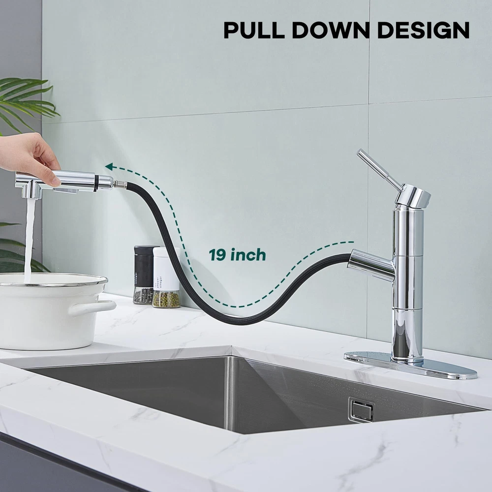 Kitchen Faucets, Chrome Kitchen Faucet with Pull Down Sprayer, Modern Stainless Steel Kitchen Sink Faucet Commercial RV Kitchen Faucet with Deck Plate 2 Modes Spray Spot Resist Product Details Color: Chrome Brand: FROPO MPN: YG-KF-058C UPC: Does not apply EAN: Does not apply Brand: FROPO Recommended Uses For Product: Bar, Bathroom, Kitchen, Outdoor Mounting Type: Deck Mount Finish Type: Polished Material: Stainless Steel Color: Chrome Number of Handles: 1 Hole Count: 1 Handle Type: handle Valve Type: Cartridge Valve Brand: FROPO Recommended Uses For Product: Bar, Bathroom, Kitchen, Outdoor Mounting Type: Deck Mount Finish Type: Polished Material: Stainless Steel Color: Chrome Number of Handles: 1 Hole Count: 1 Handle Type: handle Valve Type: Cartridge Valve Handle Material: Stainless Steel Spout Height: 5.75 Inches Spout Reach: 7 Inches Warranty Type: limited Handle Location: Center Spout Design: Low Arc Hose Length: 19 Inches Is Electric: No Manufacturer: FROPO Product Dimensions: 8"D x 1.75"W x 9"H Part Number: YG-KF-058C Item Weight: 4.44 pounds Item model number: KF-105CP Finish: Polished Batteries Included?: No Batteries Required?: No Date First Available: April 17, 2024 NO WATER LEAKAGE: The pull out kitchen faucet main body and internal piping are made of solid brass with tight joints that won't leak. The rv kitchen faucet can save 30% water. Two SPRAY MODES : The pull-out sprayer on the kitchen sink faucet with TWO spray setting modes (STREAM and SPRAY) for a steady, gentle, splash-free water flow, both of which can be used for different washing requirements. DURABLE FINISH: Our stainless steel kitchen faucet have a 5-layer surface coating that is rust and fingerprint resistant and easy to clean, simply scrub the pull down kitchen faucet with a damp cloth for a clear and neat look. AFTER SALE SERVICE: Feel free to contact us if you have any questions about our kitchen faucet with pull down sprayer, we will solve the problem perfect.