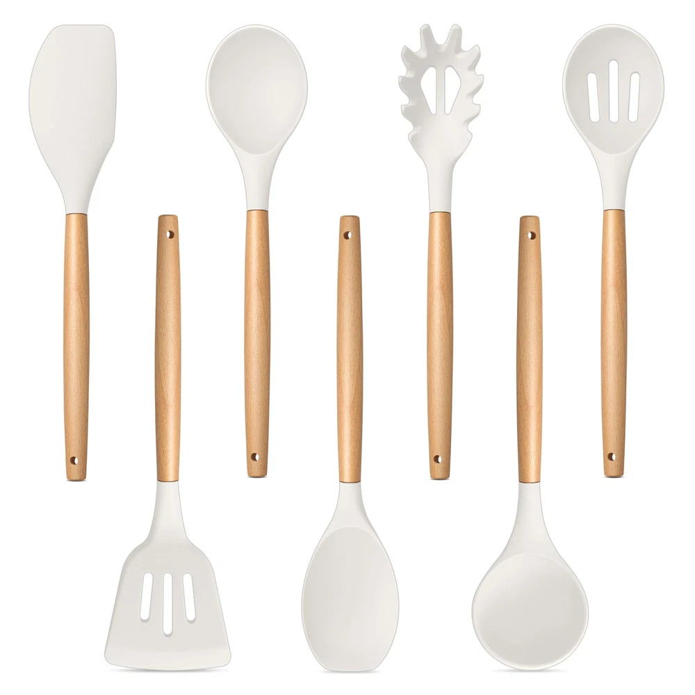 Silicone Kitchen Utensils Set of 7, made of food grade silicone and premium wood. No toxic substance leaching into food and won’t harmful to you and your families. The silicone heads are high heat resistant for no melting or deforming during. The silicone heads are strongly connected to wooden handles for not easily breaking off. Non-slip and ergonomic handles for comfortable grip. 7pcs kitchen cooking utensils for more convenient and practical in your cooking life. Specification List of Package: 7 pieces – pasta server, soup ladle, slotted turner, solid spoon, slotted spoon, spatula, spatula spoon Material: Silicone, wood Features: Nontoxic, heat proof, non scratch, non-stick, firmly connected Dimension (Length x Width) Pasta server – 12.35’’ x 2.25’’ Soup ladle – 12.5’’ x 3’’ Slotted turner – 12.75’’ x 3.3’’ Solid spoon – 12.5’’ x 2.75’’ Slotted spoon – 12.5’’ x 2.75’’ Spatula – 12.5’’ x 2.4’’ Spatula spoon – 12.4’’ x 2.6’’ Advantages Non Toxic – Made of food grade silicone and premium wood, ensuring nontoxic and healthy cooking. Heat Proof – Premium silicone heads are high heat-proof, no melting, no deforming or no bending when cooking. Long Ergonomic Handle – Long handle design keeps your hand away from the heat and wooden handles for better heat insulation to avoid burning your hand. Non Scratch – Soft silicone heads effectively avoid scratching your nonstick pans and pots’ surfaces. Easy Cleanup – Non-stick smooth surface helps easily clean by hands, make cleaning a breeze. Using Instructions 1. Please wash them with warm water before first using to wash off any residue left from manufacturing. 2. Please wash with soapy water and clean them with soft dishcloth or sponge to avoid scratching the surface. NOT DISHWASHER SAFE. 3. Please dry them immediately rather than air dry for a longer lifespan. 4. Please do not directly put the silicone kitchen utensils on the flame. FOOD GRADE SILICONE – kitchen utensils set is made of premium food grade silicone without any toxic substance and doesn’t react with food to affect its taste, Let you enjoy the pleasant and safe cooking experience HEAT RESISTANT – This cooking utensils set can withstand high temperature up to 446°F/230°C, No melting or deforming during cooking, Silicone head with high softness to keep your non-stick frying pans or stock pots from scratching, Extend their service life and long lasting for years, A great replacement of metallic cooking utensils ERGONOMIC WOODEN HANDLE – This silicone kitchen utensils’ handles are made of solid wood, Smooth surface without any sharp spurs to provide comfortable grip, Anti-scald wood handle effectively protects your hand from burning during heat transferring EASY CLEAN & STORE –Non-stick surface for easy food releasing to help clean easily, Hand wash recommended for better maintenance (No Dishwasher Safe), A utility hanging hole on the wooden handle for easily being hung neatly on the wall for convenient storage and drying faster after washing GREAT VALUE SET – The silicone cooking utensils set includes 1 X pasta server, 1 X soup ladle, 1 X slotted turner, 1 X slotted spoon, 1 X solid spoon, 1 X spatula, 1 X round spatula, 7 different shapes for meeting your daily basic cooking needs, Practical and versatile for turning, mixing, serving and more, A great helper in your kitchen