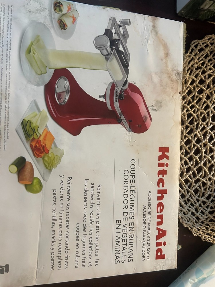 KitchenAid Vegetable Sheet Cutter attachment – lightly used and fully sanitized. The tool and all components are clean and in excellent working condition; the original box has some marks but is included. Compatible with all KitchenAid stand mixers Includes cutter and core removal blade Easy to clean, all parts sanitized before shipping