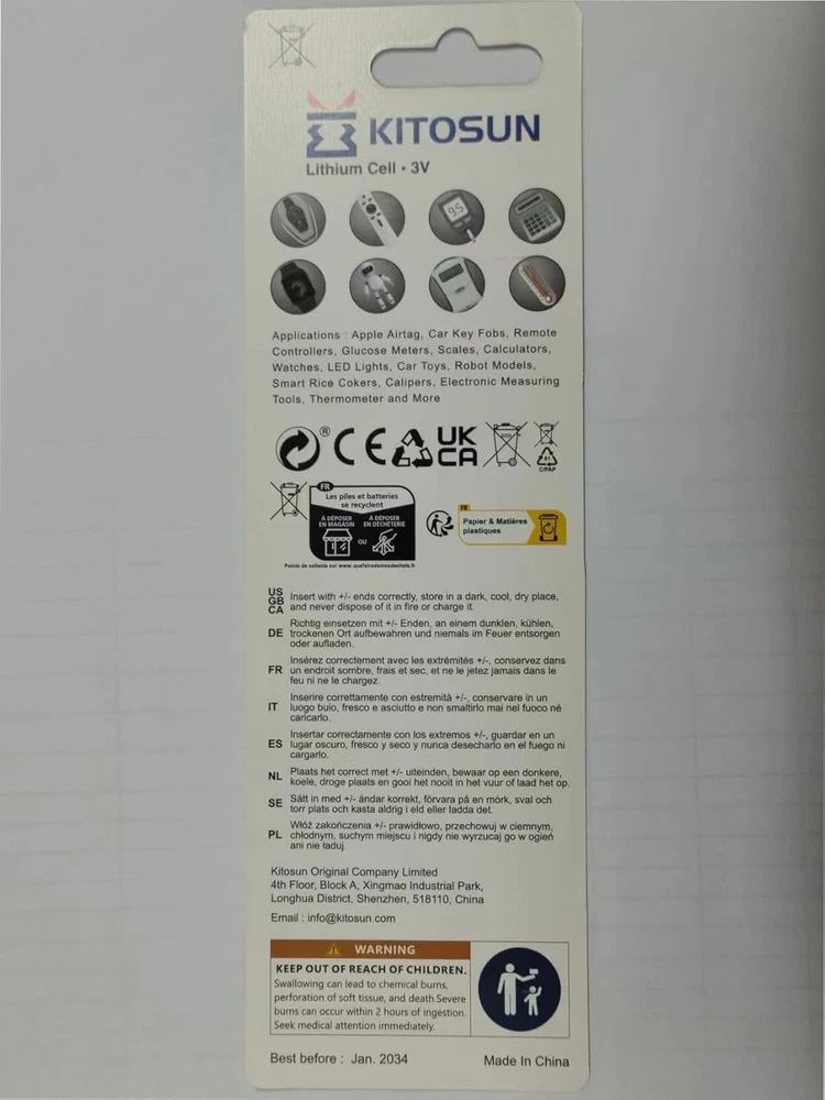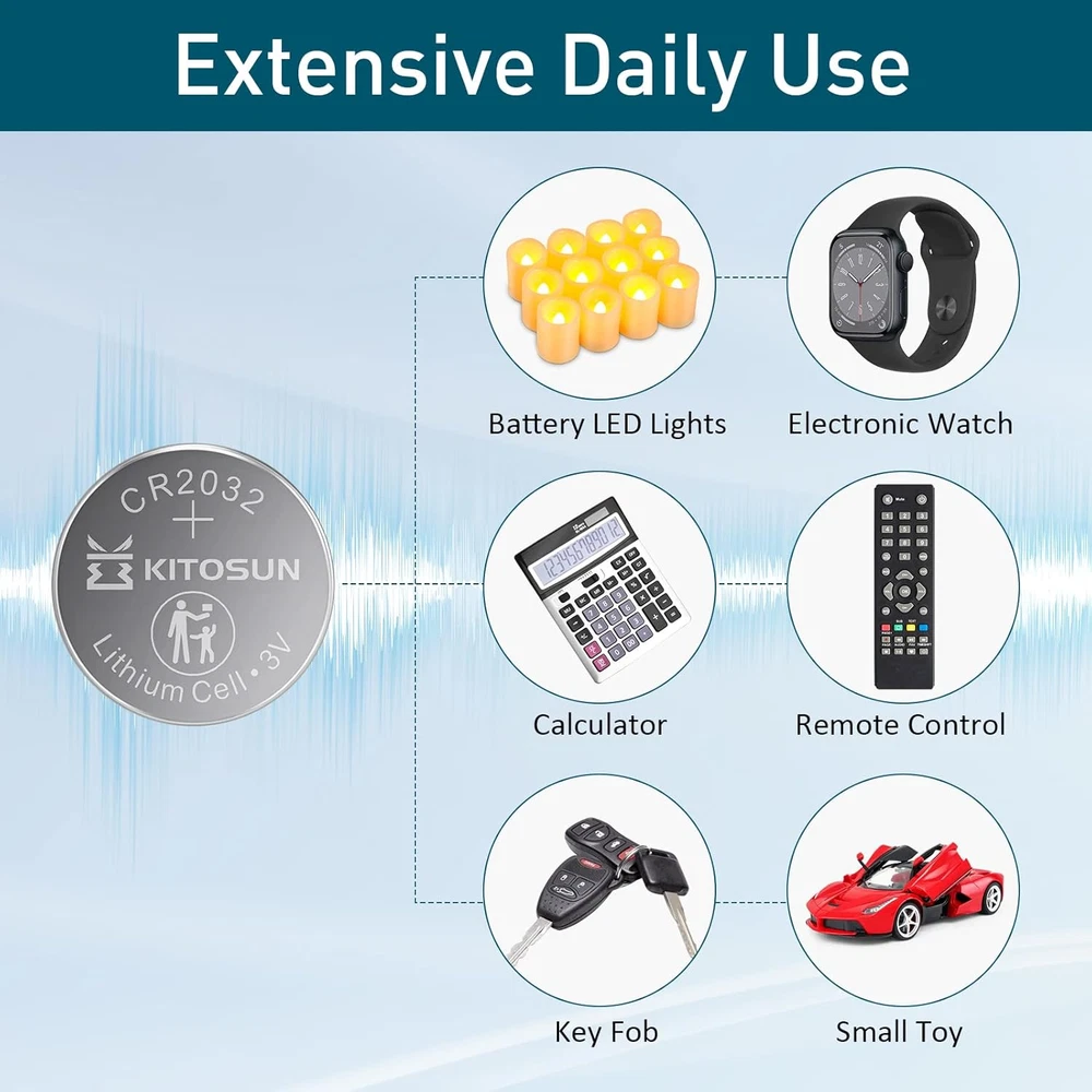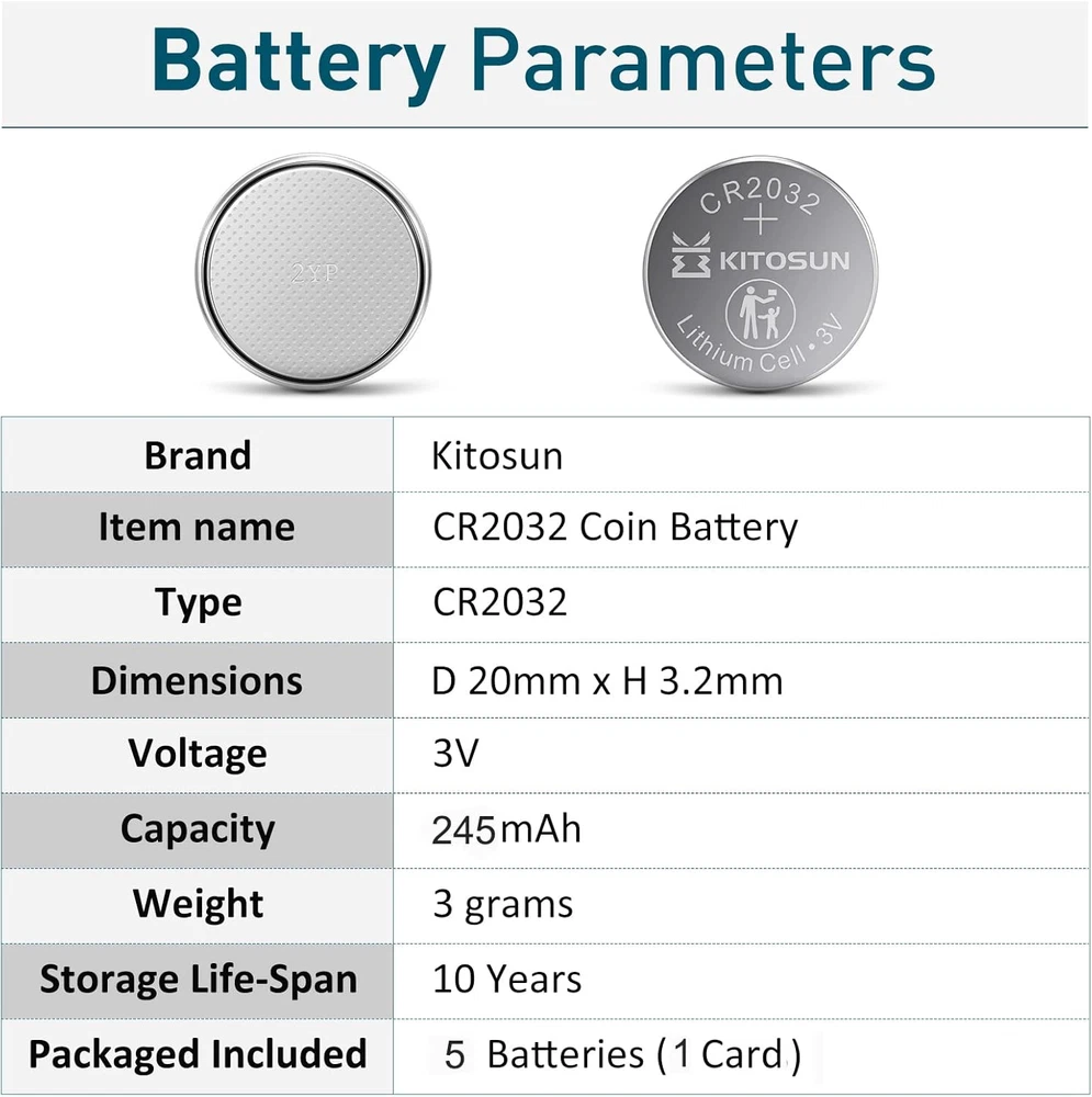 Kitosun CR2032 3V Lithium Coin Battery 5 Pack for Apple Airtag & Car Key Fob These high-performance Kitosun CR2032 batteries provide long-lasting power for various electronic devices. The batteries are engineered for reliability and compatibility with a wide range of devices like Apple Airtag, car key fobs, glucose monitors, and more. Features: High Capacity (245mAh): 10% more capacity than standard CR2032 batteries for longer-lasting power. Wide Compatibility: Works with devices like Apple Airtag, car key fobs, remote controls, glucose meters, thermometers, and LED tea light candles. Long Shelf Life: Up to 10 years of storage life, ensuring your batteries are ready when you need them. Child-Secure Packaging: Ensures safety with packaging that’s nearly impossible to open without scissors. Leak-Free and Rust-Proof: Advanced sealing technology prevents leakage, short-circuiting, and rust. Reliable Power Source: Powers both daily and essential home devices, such as remote controls, medical devices, and pet collars. Compatible with: Apple Airtag, CR2032, BR2032, DL2032, KCR2032, Energizer CR2032, and more. Thank you for viewing our Kitosun CR2032 3V Lithium Coin Battery 5 Pack for Apple Airtag & Car Key Fob.