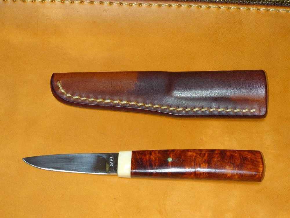 Product description This is a knife that I once received directly from Mr. Kiyoshi Kato, whom I had a chance to meet. There is only No. 1 blank paper and it cuts well. There is a KATO stamp on the base. Mr. Kiyoshi Kato says that in recent years, it has been difficult to obtain quince bulbs this red. He said. It's a masterpiece. ●Main specifications Blade length: 5.6cm Blade thickness: 3mm Handle length: 8cm Steel material: Shirogami No. 1 Handle material: Quince Accessories: Leather sheath ★Kiyoshi Kato Born in Tokyo in 1944 to a family of swordsmiths, he began training as a swordsmith at the age of 20. Although he was a swordsmith, he also showed an understanding of Western knives, and began making knives in 1977. The knives that Mr. Kato makes have the shape of Western knives, but they are made using the techniques of swordsmiths such as forge welding, forging, and folding, making them unique to Mr. Kato. The same inscription of Yoshiaki Fujiwara as his predecessor is engraved on cutlery and other cutlery such as knives. In 2000, he moved his workshop from Meguro, Tokyo to Hokuto City, Yamanashi Prefecture. ★Karinchu is a burr that is collected from a part of the root of the quince tree, a broad-leaved tree belonging to the leguminous family. It is popular as a material for high-end crafts. 【Features】 The wood grain is beautiful and creates intricate intersecting patterns. Particularly, the part with a mixture of dark and light parts is called ``Kohaku'' and is extremely valuable. ★The condition of the product is slightly scratched and dirty. For "remote delivery areas", additional fees will be chargeThese charges are normally collected by the delivering freight(shipping) company or when you pick the item up. -do not confuse them for additional shipping charges. We do not mark merchandise values below value or mark items as "gifts". -US and International government regulations prohibit such behavior.d. Import duties,taxes and charges are not included in the item price or shipping charges. These charges are the buyer's responsibility.