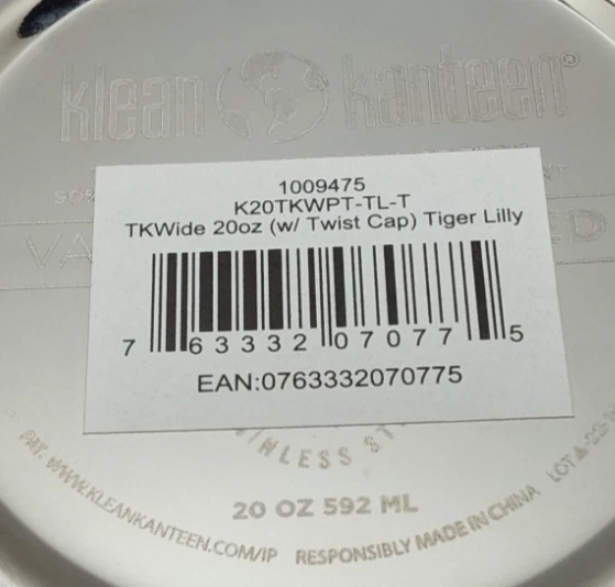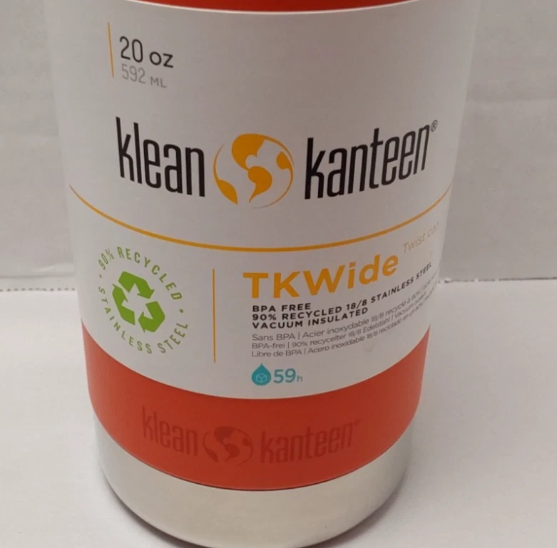 Klean Kanteen 20 oz TKWide Insulated Water Bottle Tiger Lily Leak Proof BPA Free Climate Lock vacuum insulation; Made from certified 90 percent post-consumer recycled 18/8 stainless steel Splash proof lid; Ergonomic stainless steel handle Colored mugs come with chip-resistant Klean Coat finish (stainless excluded); Choose from solid colors or laser engraved graphics BPA-free; Easy clean Wash your cup before first use; Hand wash with warm soapy water or diluted vinegar and baking soda; Do not use bleach or cleaners containing chlorine or abrasives