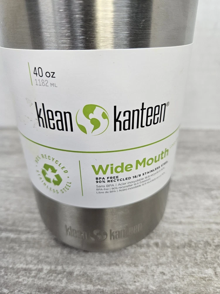 The Klean Kanteen Classic Wide Mouth Stainless Steel Water Bottle is a 40oz silver colored water bottle made of stainless steel. It features a wide mouth design and is branded with the Klean Kanteen logo. Ideal for outdoor activities such as camping and hiking, this water bottle is perfect for staying hydrated on the go.