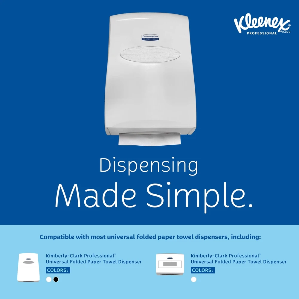 Kleenex Professional Universal Multifold Paper Towels, Bulk (01890), Absorbency Pockets, 9.2" x 9.4" Towel, White (150 Sheets/Pack, 16 Packs/Case, 2,400 Sheet Total) Product Details Color: White Size: 150 Count (Pack of 16) Brand: Kleenex Professional MPN: 1890 UPC: 036000018905 EAN: 0036000018905 Brand: Kleenex Professional Unit Count: 16.0 Count Sheet Count: 2400 Ply Rating: 1-Ply Special Feature: Absorbent Is Discontinued By Manufacturer : No Product Dimensions : 24.02 x 13.39 x 9.8 inches; 11.02 Pounds Item model number : 1890 Date First Available : November 9, 2004 Manufacturer : Kimberly-Clark Professional Country of Origin : USA 150 Sheets/Pack, 16 Kleenex Multifold Paper Towel Packs/Case; 2,400 Sheets/Case; 1-Ply; 9.2" x 9.4" sheets; White; fits universal multi-fold towel dispensers Improved softness; Kleenex Multifold Paper Towels are soft and highly absorbent for reduced waste Designed to dispense one at a time They meet EPA minimum standards These Kleenex towels are FSC and ECOLOGO certified Your image is important, especially for your business. Providing top-quality Kleenex Multifold Paper Towels in your office washroom and kitchen lets your employees and guests know that you care enough to offer the very best experience. Now more gentle on the skin, each paper towel is made with soft, absorbent material, so users will use fewer paper towels and waste less. Featuring improved softness, these folded towels are designed to dispense one at a time, while bringing the next towel forward for another user. These Kleenex tri fold paper towels meet EPA minimum standards, are FSC and ECOLOGO certified and feature recyclable packaging, so you can choose confidently.