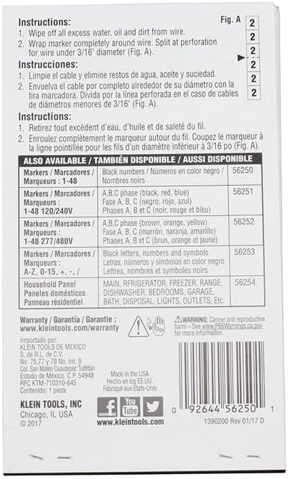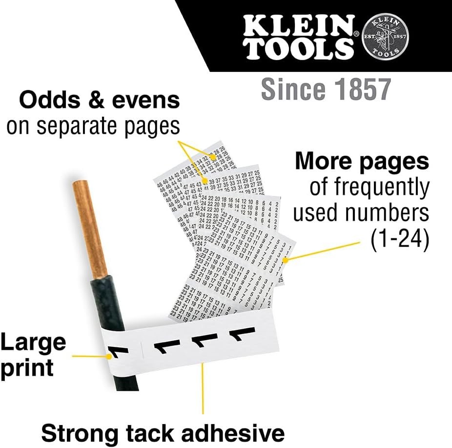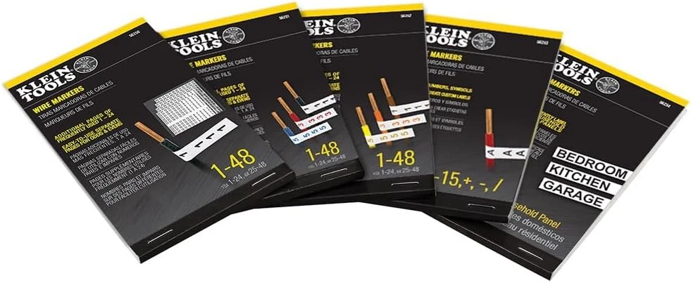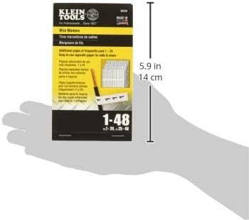 Klein Tools 56250 Wire Marker Book 1 Count (Pack of 1), Black Print on White Product Details Manufacturer: Klein Tools Part Number: 56250 Item Weight: 2.1 ounces Product Dimensions: 5.2 x 3.2 x 0.15 inches Country of Origin: USA Item model number: 56250 Is Discontinued By Manufacturer: No Size: 1 Count (Pack of 1) Color: Black Print on White Style: Standard Material: Vinyl Coated White Cloth Shape: Rectangular Item Package Quantity: 1 Special Features: Large Print Included Components: Wire Markers - Numbers 1-48 Batteries Included?: No Batteries Required?: No Color: Black Print on White Size: 1 Count (Pack of 1) Material: Vinyl Coated White Cloth Brand: Klein Tools Shape: Rectangular QUICK AND EASY LABELING: Klein Tools' Wire Marker Book allows you to label wires quickly and effortlessly, streamlining your wire identification process MORE PAGES FOR LOW NUMBERS: This marker book includes more pages dedicated to frequently used low numbers (1-24), ensuring you have an ample supply of these commonly labeled markers SEPARATE PAGES FOR PANEL DRESSING: Easily dress each side of the panel with separate pages of odd or even markers, providing a clean and organized labeling solution EASY-TO-READ PRINT: The markers feature larger, easy-to-read print on 0.25-Inch x 1.5-Inch labels, making wire identification hassle-free, even in challenging environments PERFORATED PAGES: Each page is perforated, allowing for easy detachment of a third, two-thirds, or the entire page, enabling you to customize your labeling needs Label wires quickly and easily with Klein Tools new preprinted panel and wire markers. These markers are made of durable vinyl coated cloth and contain larger print to make them easier to read. Klein is now offering marker books in five different configurations to meet every labeling need. For more than 160 years, Klein Tools has manufactured premium-quality, professiol-grade hand tools that deliver the performance, durability and precision needed to get the job done right. Our family of engineers, workers and craftsman continue to put six generations of expertise into every tool we create by using only the highest quality materials, superior workmanship, and keeping manufacturing as close to home as we can. Klein isn't just the me of our company, it's also our family me. And since we're an American company that's family-owned and family-run, you know you can count on us to be here tomorrow. Klein Tools doesn't just make great products, we make great products that stand up to the demands of the professiols who use them every day ... Since 1857.